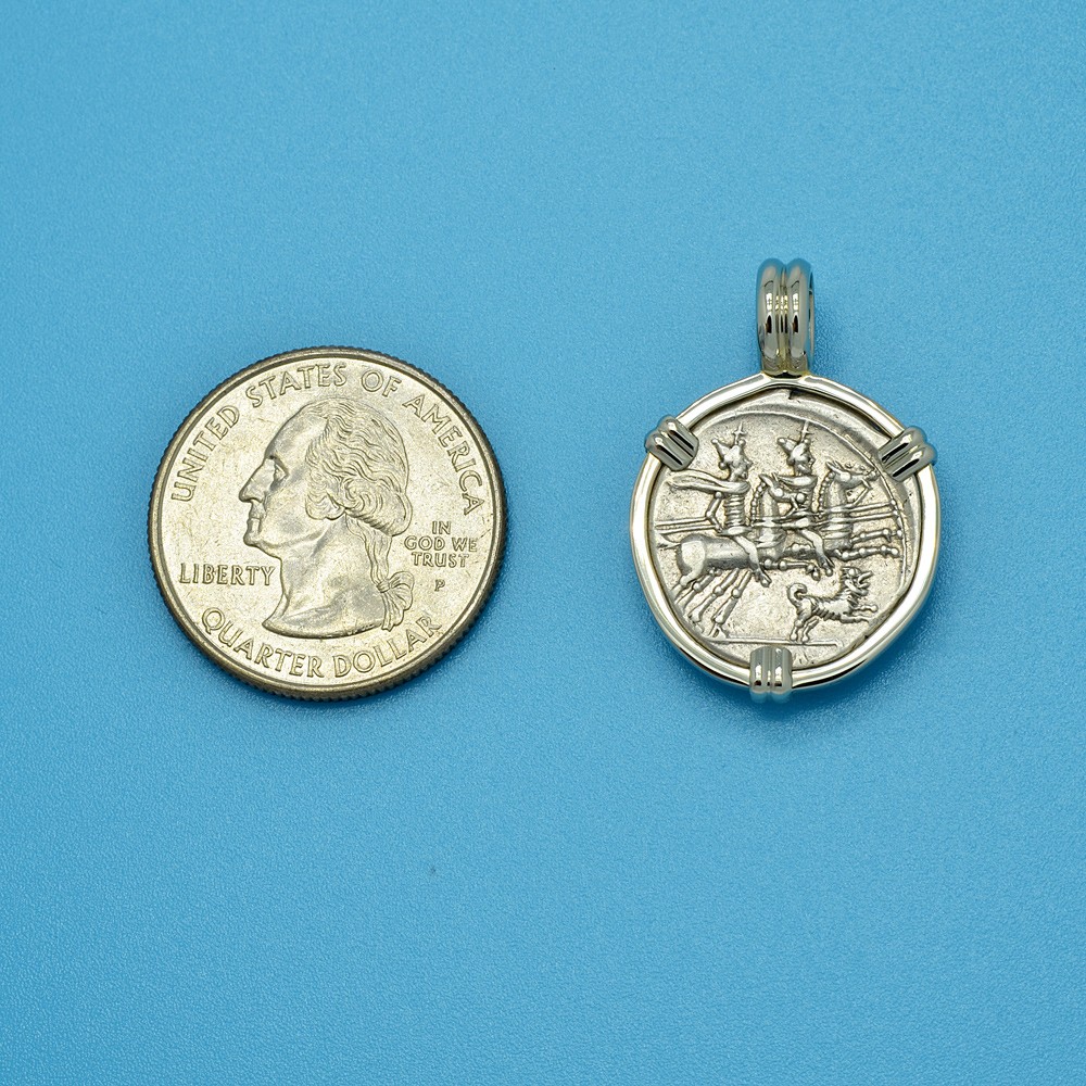 This hand struck denarius coin was minted in Rome by moneyer Caius Antestius in 146 BC. The obverse of this Roman Republic coin shows the mythological twins Castor and Pollux galloping on horseback while holding spears, with a dog running below. They were excellent horsemen and revered by the Romans as the Dioscuri. The Twins were devoted brothers and regarded as helpers of mankind, particularly travelers and sailors. They were also legendary warriors and the Romans believed the Dioscuri aided them on the battlefield. According to legend, in the 495 BC Battle of Lake Regillus, the twins fought at the head of the Roman army in the victory against the Latin League.