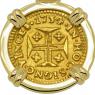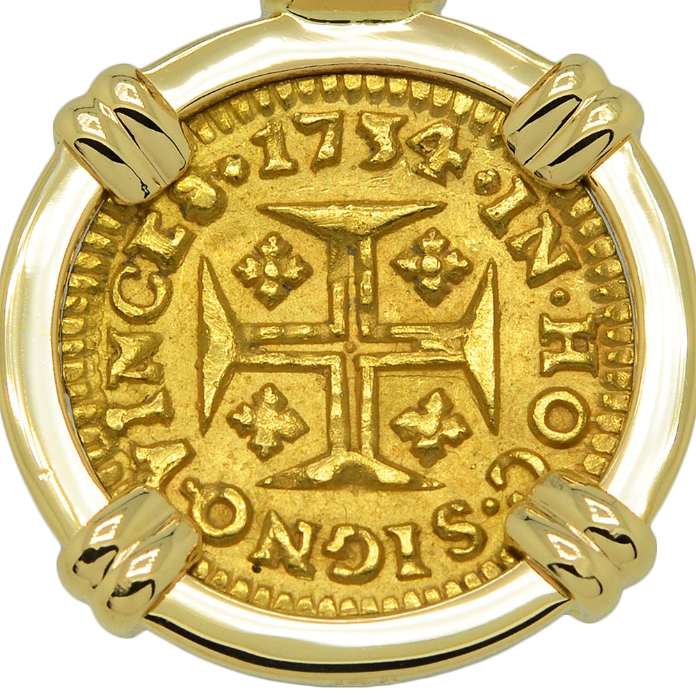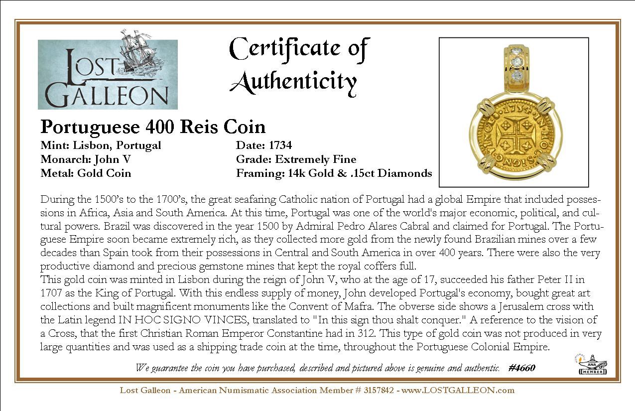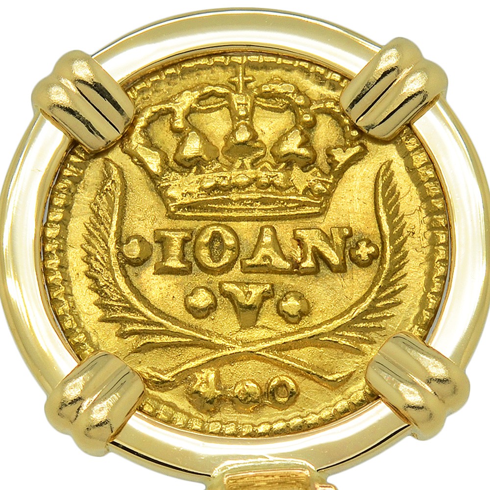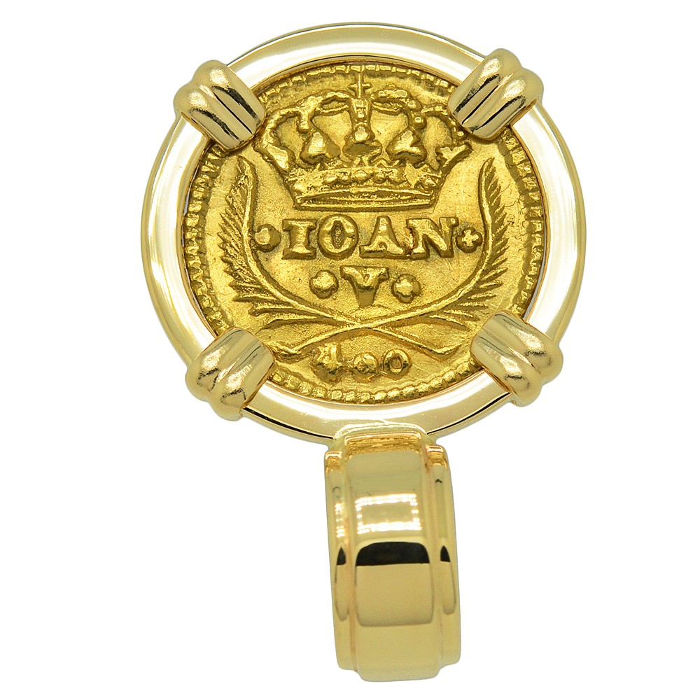 This gold coin was minted in Lisbon during the reign of John V, who at the age of 17, succeeded his father Peter II in 1707 as the King of Portugal. With this endless supply of money, John developed Portugal's economy, bought great art collections and built magnificent monuments like the Convent of Mafra. The obverse side shows a Jerusalem cross with the Latin legend IN HOC SIGNO VINCES, translated to "In this sign thou shalt conquer." A reference to the vision of a Cross, that the first Christian Roman Emperor Constantine had in 312. This type of gold coin was not produced in very large quantities and was used as a shipping trade coin at the time, throughout the Portuguese Colonial Empire.