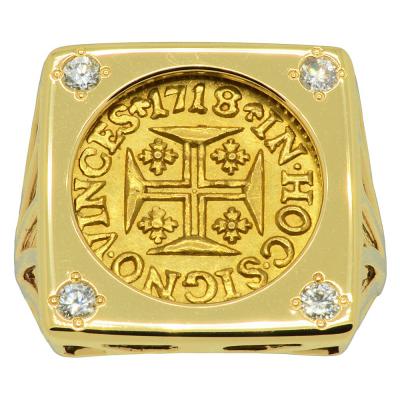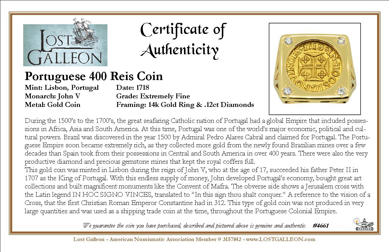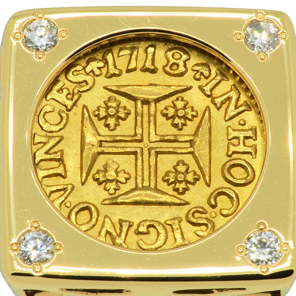 This gold coin was minted in Lisbon during the reign of John V, who at the age of 17, succeeded his father Peter II in 1707 as the King of Portugal. With this endless supply of money, John developed Portugal's economy, bought great art collections and built magnificent monuments like the Convent of Mafra. The obverse side shows a Jerusalem cross with the Latin legend IN HOC SIGNO VINCES, translated to "In this sign thou shalt conquer." A reference to the vision of a Cross, that the first Christian Roman Emperor Constantine had in 312. This type of gold coin was not produced in very large quantities and was used as a shipping trade coin at the time, throughout the Portuguese Colonial Empire.