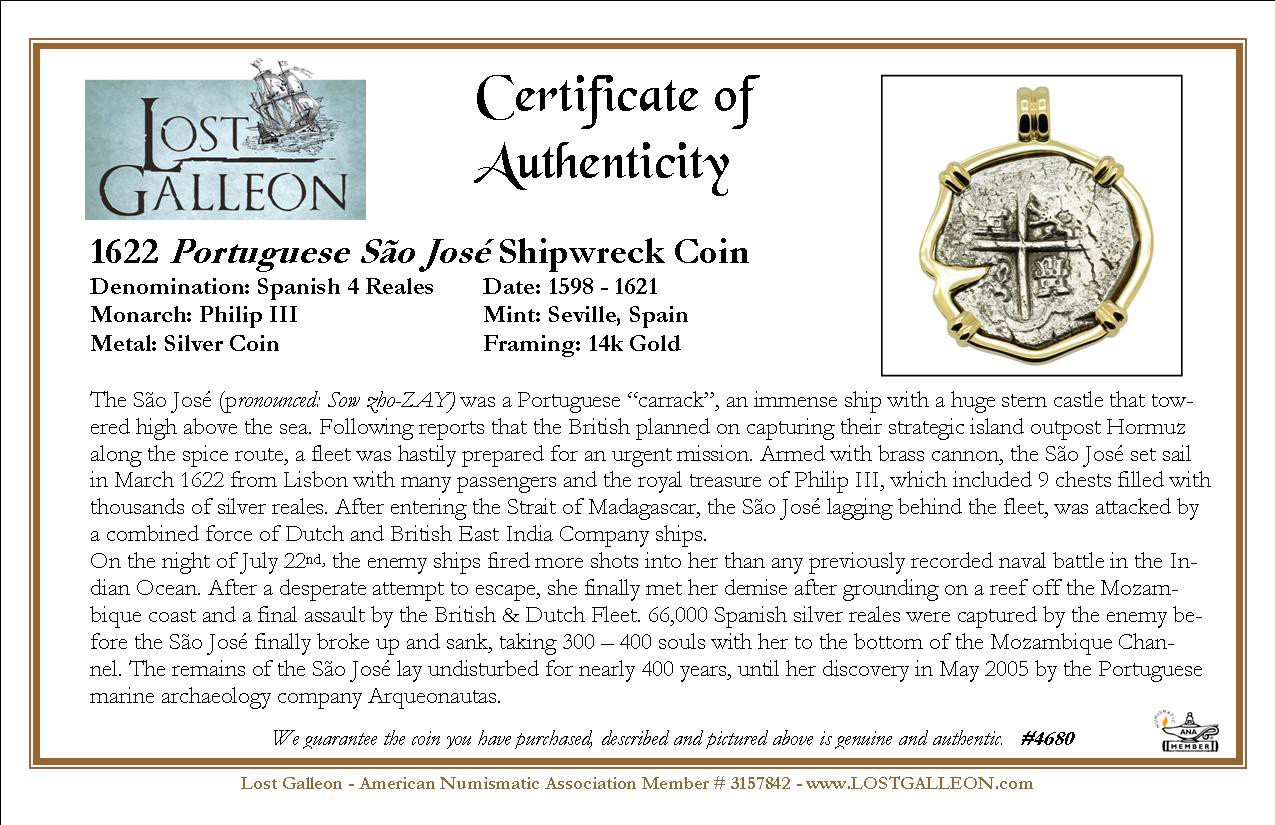 Arqueonautas salvagers certificate included. The São José (pronounced: Sow zho-ZAY) was a Portuguese “carrack”, an immense ship with a huge stern castle that towered high above the sea. Following reports that the British planned on capturing their strategic island outpost Hormuz along the spice route, a fleet was hastily prepared for an urgent mission. Armed with brass cannon, the São José set sail in March 1622 from Lisbon with many passengers and the royal treasure of Philip III, which included 9 chests filled with thousands of silver reales. After entering the Strait of Madagascar, the São José lagging behind the fleet, was attacked by a combined force of Dutch and British East India Company ships.
