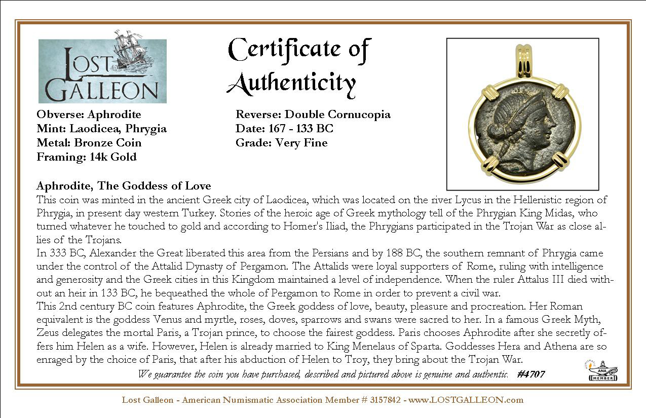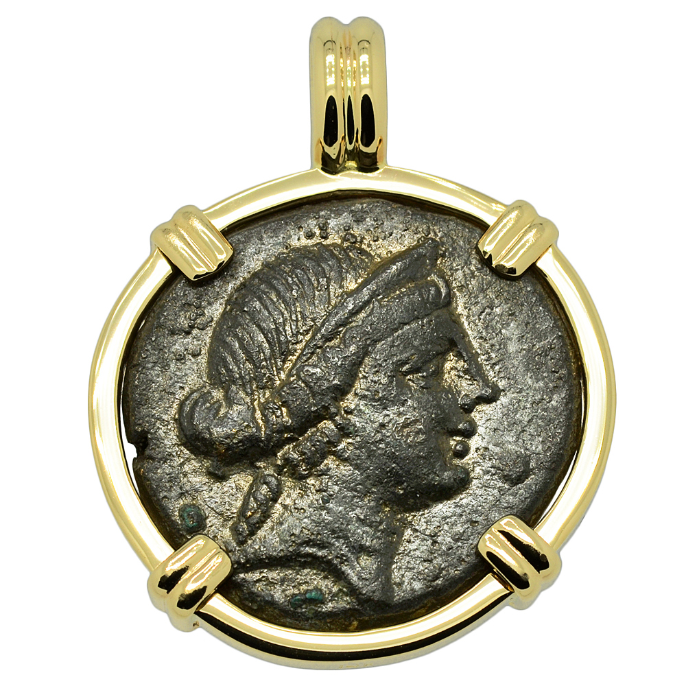 This 2nd century BC coin features Aphrodite, the Greek goddess of love, beauty, pleasure and procreation. Her Roman equivalent is the goddess Venus and myrtle, roses, doves, sparrows and swans were sacred to her. In a famous Greek Myth, Zeus delegates the mortal Paris, a Trojan prince, to choose the fairest goddess. Paris chooses Aphrodite after she secretly offers him Helen as a wife. However, Helen is already married to King Menelaus of Sparta. Goddesses Hera and Athena are so enraged by the choice of Paris, that after his abduction of Helen to Troy, they bring about the Trojan War.