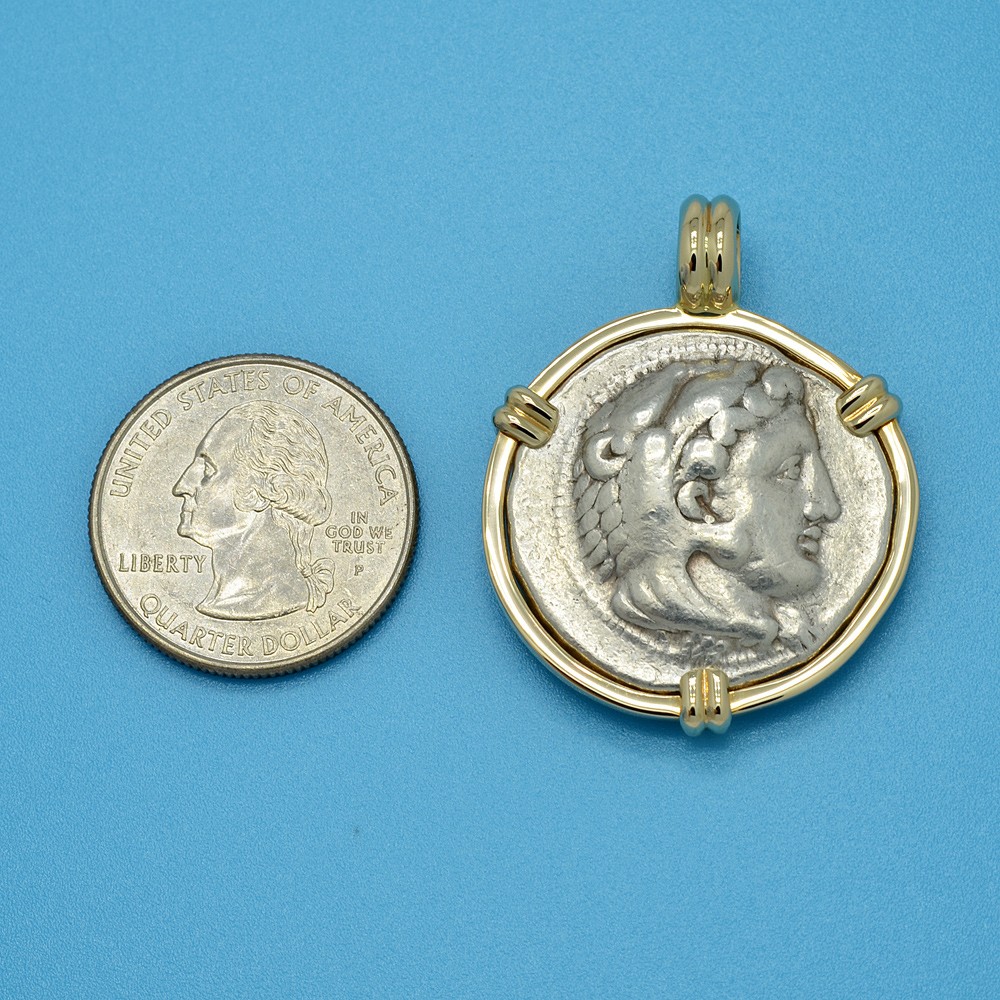 This Alexander the Great coin was minted during his lifetime in the city of Tarsos, located near the Mediterranean Sea in present-day southern Turkey. Tutored by Aristotle in his youth, Alexander succeeded his murdered father King Philip II in 336 BC, inheriting a strong kingdom and an experienced army. He took full advantage and in 334 BC, Alexander attacked and defeated the Persian forces at the Battle of the Granicus. Alexander then marched his army south along the coast, liberating this Greek Asia Minor region from the Persians. Alexander entered the city of Tarsos in the spring of 333 BC without a struggle, but nearly died here of sickness. He eventually recovered and in November 333 BC, Alexander led his Macedonian troops to a decisive victory over King Darius and the Persians in the Battle of Issos.