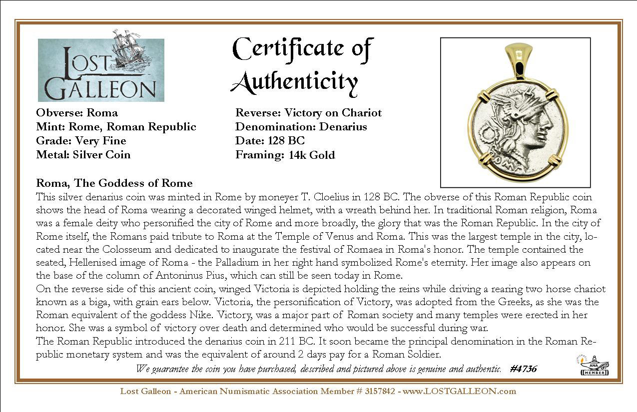This silver denarius coin was minted in Rome by moneyer T. Cloelius in 128 BC. The obverse of this Roman Republic coin shows the head of Roma wearing a decorated winged helmet, with a wreath behind her. In traditional Roman religion, Roma was a female deity who personified the city of Rome and more broadly, the glory that was the Roman Republic. In the city of Rome itself, the Romans paid tribute to Roma at the Temple of Venus and Roma. This was the largest temple in the city, located near the Colosseum and dedicated to inaugurate the festival of Romaea in Roma's honor. The temple contained the seated, Hellenised image of Roma - the Palladium in her right hand symbolized Rome's eternity. Her image also appears on the base of the column of Antoninus Pius, which can still be seen today in Rome.