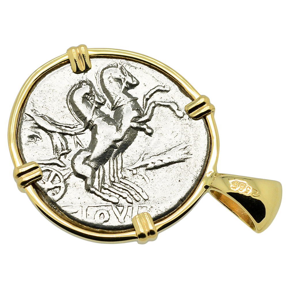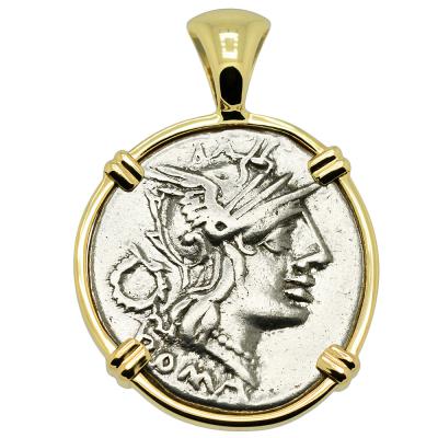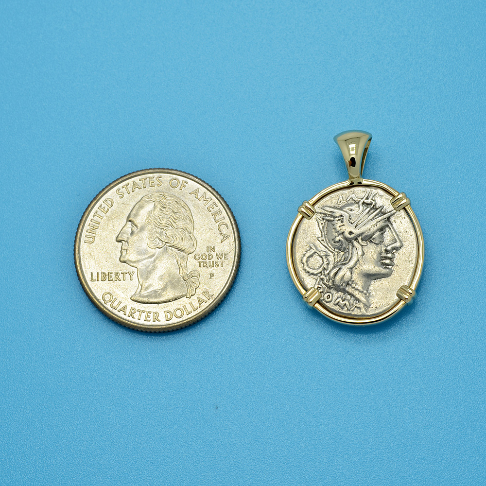 • Silver Denarius Coin in 14k Gold Pendant, Weight 5.6g