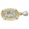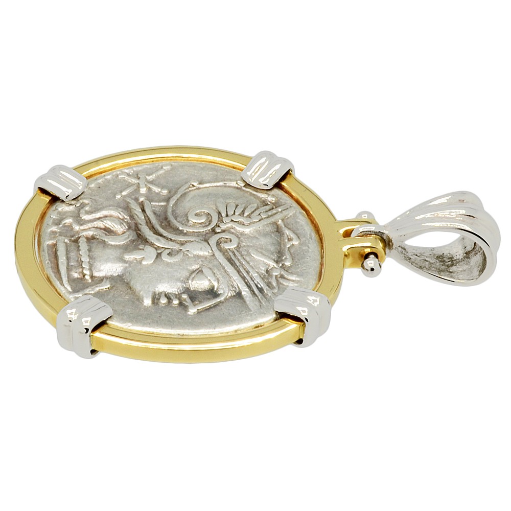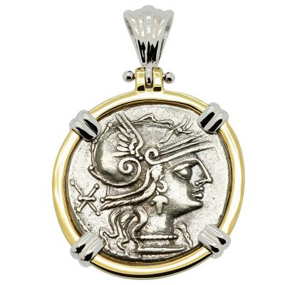 In ancient Roman religion, Jupiter was the king of the gods and the god of sky and thunder. He was the equivalent of Zeus to the Greeks. Beginning in 509 BC, the most important temple in Rome was that of Jupiter on the Capitoline Hill. On the roof was a triumphal chariot drawn by four horses with Jupiter himself as the charioteer, holding a scepter and the reigns, while hurling a thunderbolt, just as he is depicted on this ancient coin. This temple was surrounded by the Area Capitolina, a precinct where certain assemblies met and numerous shrines, altars, statues and victory trophies were displayed.