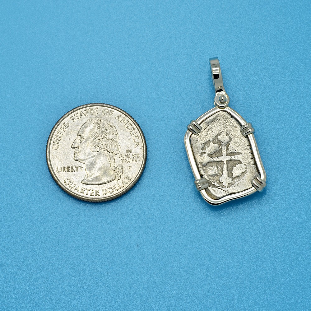Spanish coins, known as "cobs", that circulated in this epic era were hand struck from dies and cut to weight. Minted in five denominations in silver, the largest was the 8 reales, famous in the colonies and among pirates as a “piece of eight.” The other denominations were 4 reales, 2 reales, 1 real and 1/2 real. Cob coins with their unusual shapes are all unique, making each a one-of-a-kind piece of history.