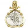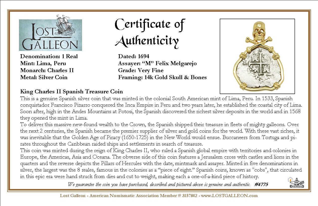 This coin was minted during the reign of King Charles II, who ruled a Spanish global empire with territories and colonies in Europe, the Americas, Asia and Oceana. The obverse side of this coin features a Jerusalem cross with castles and lions in the quarters and the reverse depicts the Pillars of Hercules with the date, mintmark and assayer. Minted in five denominations in silver, the largest was the 8 reales, famous in the colonies as a “piece of eight.” Spanish coins, known as "cobs", that circulated in this epic era were hand struck from dies and cut to weight, making each a one-of-a-kind piece of history.