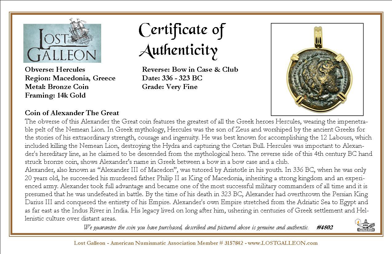 The obverse of this Alexander the Great coin features the greatest of all the Greek heroes Hercules, wearing the impenetrable pelt of the Nemean Lion. In Greek mythology, Hercules was the son of Zeus and worshiped by the ancient Greeks for the stories of his extraordinary strength, courage and ingenuity. He was best known for accomplishing the 12 Labours, which included killing the Nemean Lion, destroying the Hydra and capturing the Cretan Bull. Hercules was important to Alexander's hereditary line, as he claimed to be descended from the mythological hero. The reverse side of this 4th century BC hand struck bronze coin, shows Alexander’s name in Greek between a bow in a bow case and a club.