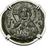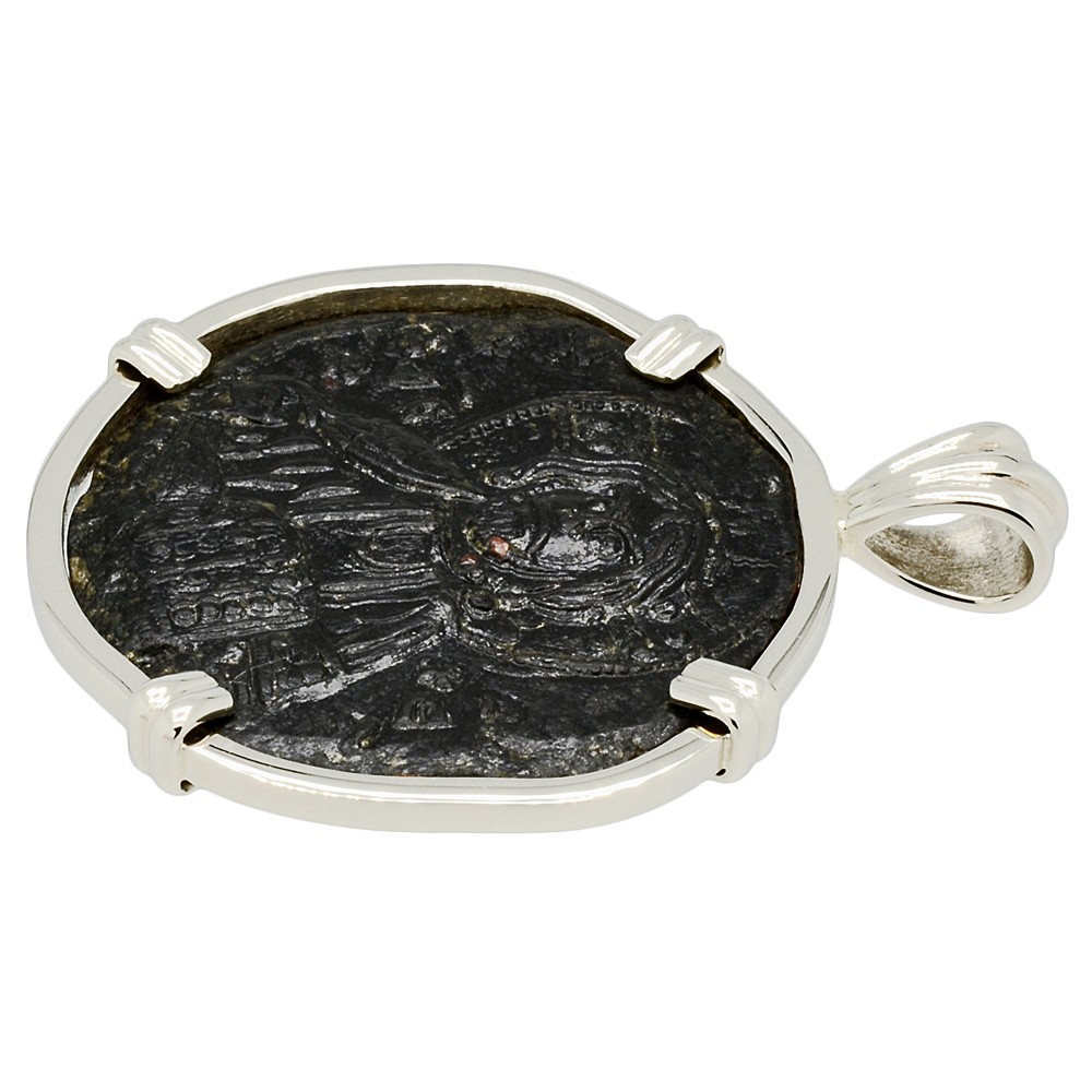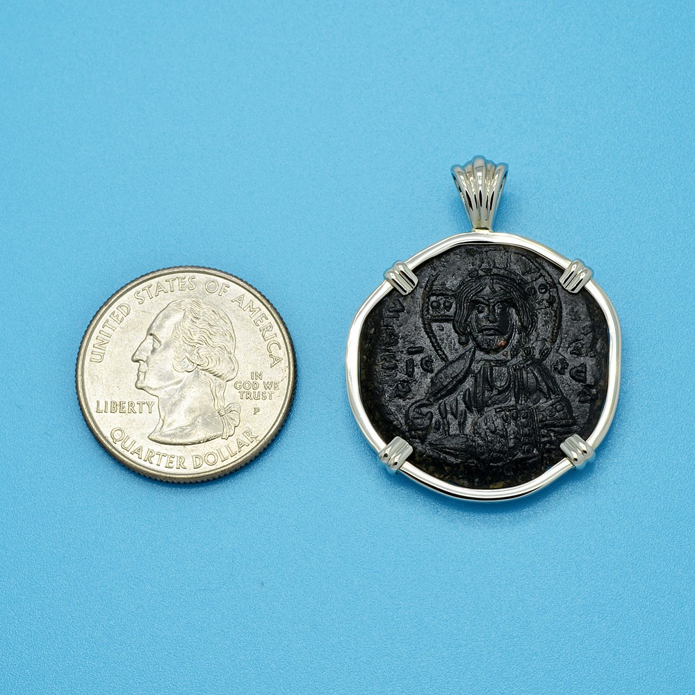 The obverse of this Byzantine bronze coin depicts the portrait of Jesus Christ Pantokrator “Christ in Majesty” with a nimbus crown, while he is holding the Book of Gospels. The reverse shows the inscription IhSUS XRISTUS bASILEU bASILE , which translates to "Jesus Christ King of Kings." This coin was hand struck during the reign of Basil II who was one of the most effective Byzantine rulers and oversaw a great expansion of the Empire. As this coin shows, art of the Byzantine Empire was mainly devoted to the Christian faith which flourished for over a thousand years under their protection.
