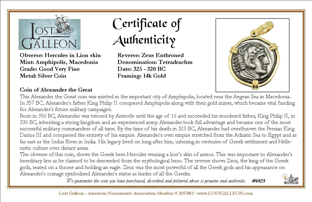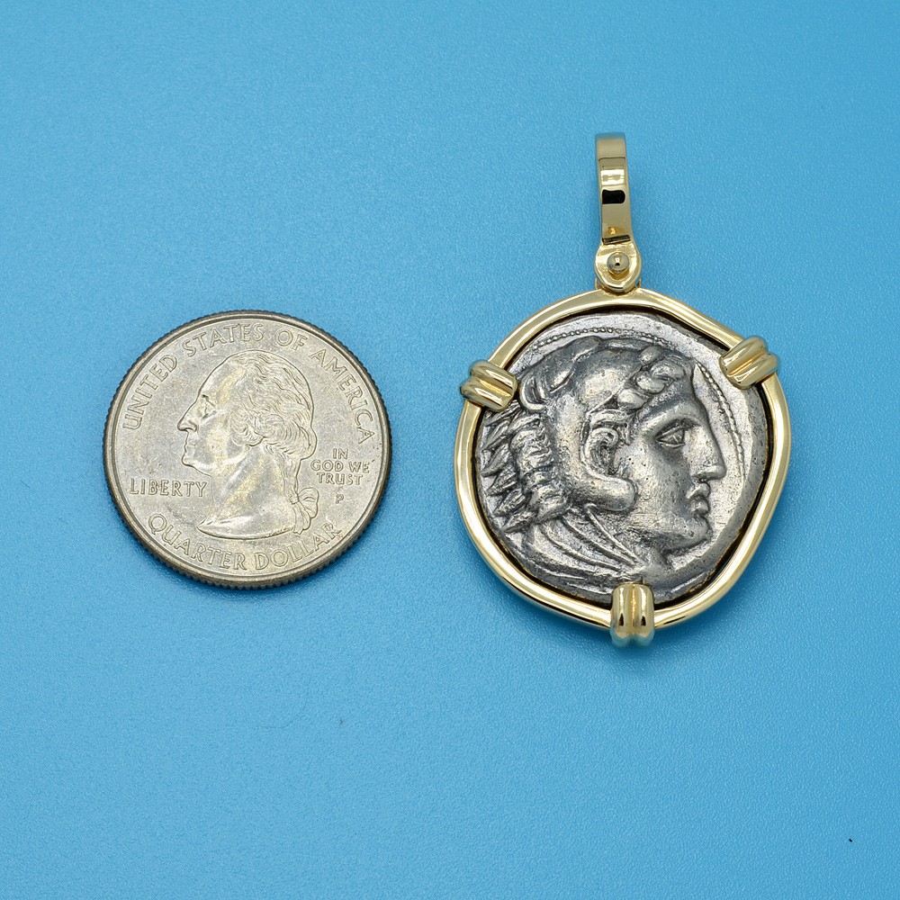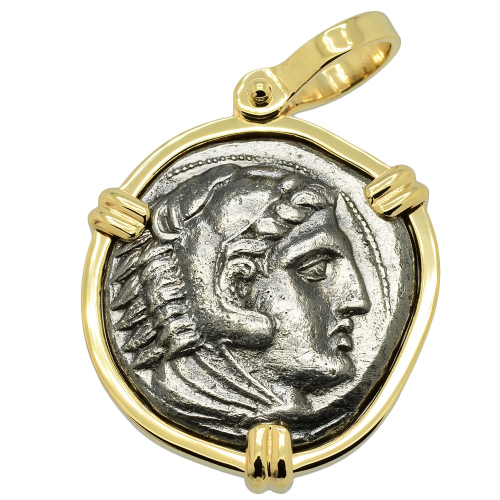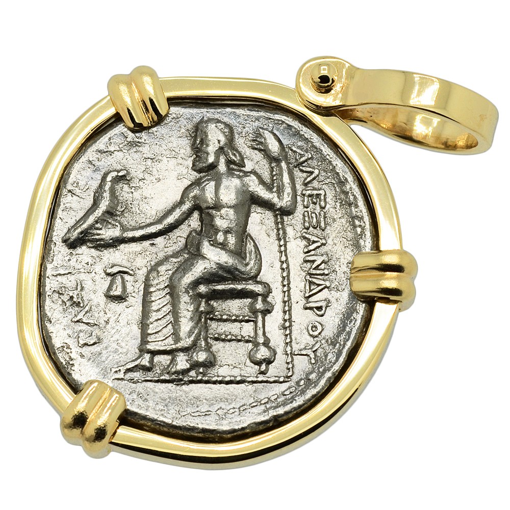 The obverse of this coin, shows the Greek hero Hercules wearing a lion’s skin of armor. This was important to Alexander's hereditary line as he claimed to be descended from the mythological hero. The reverse shows Zeus, the king of the Greek gods, seated on a throne and holding an eagle. Zeus was the most powerful of all the Greek gods and his appearance on Alexander's coinage symbolized Alexander's status as leader of all the Greeks.