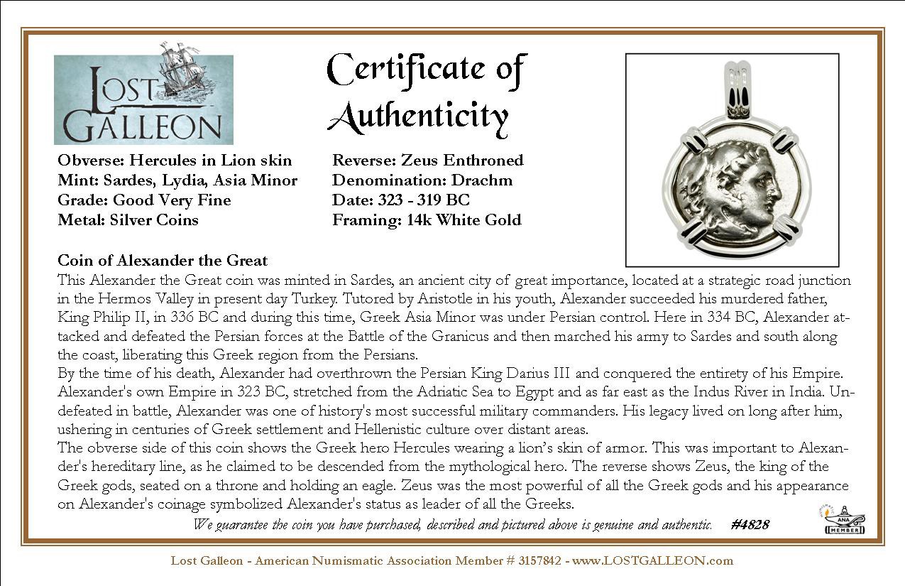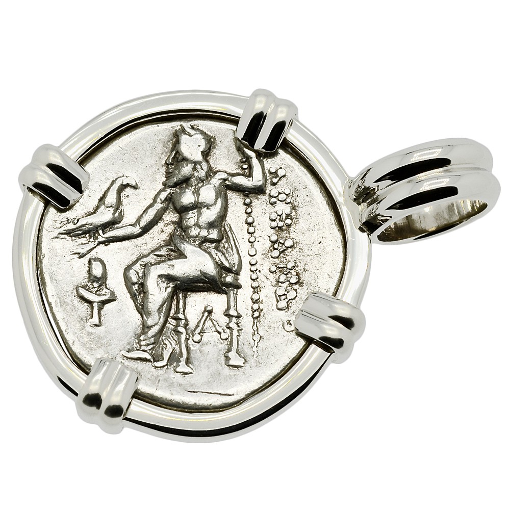 The obverse side of this coin shows the Greek hero Hercules wearing a lion’s skin of armor. This was important to Alexander's hereditary line, as he claimed to be descended from the mythological hero. The reverse shows Zeus, the king of the Greek gods, seated on a throne and holding an eagle. Zeus was the most powerful of all the Greek gods and his appearance on Alexander's coinage symbolized Alexander's status as leader of all the Greeks.