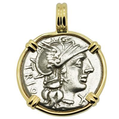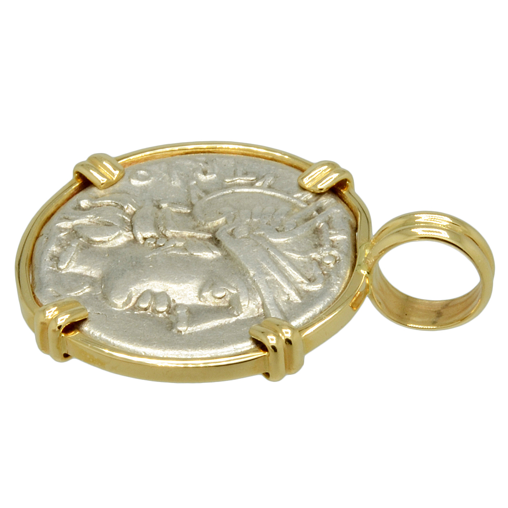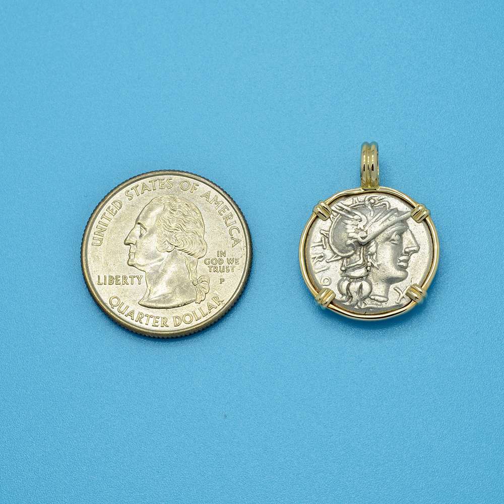 • Silver Denarius Coin in 14k Gold Pendant, Weight 5.2g