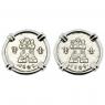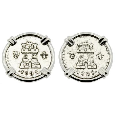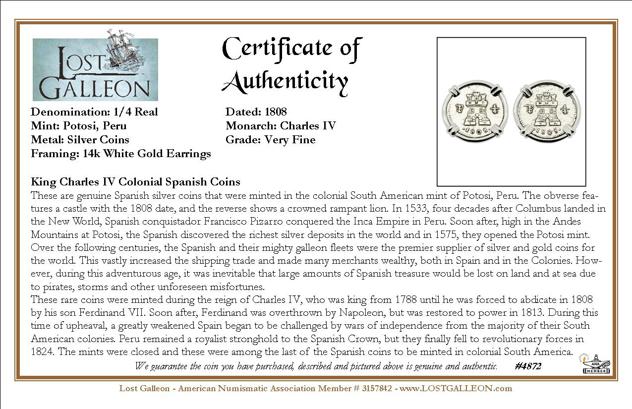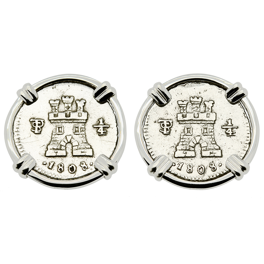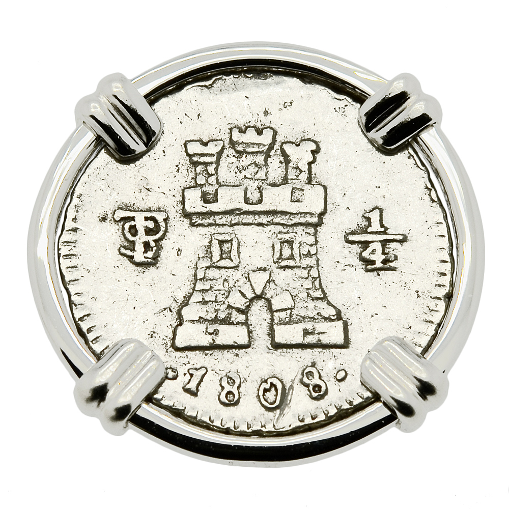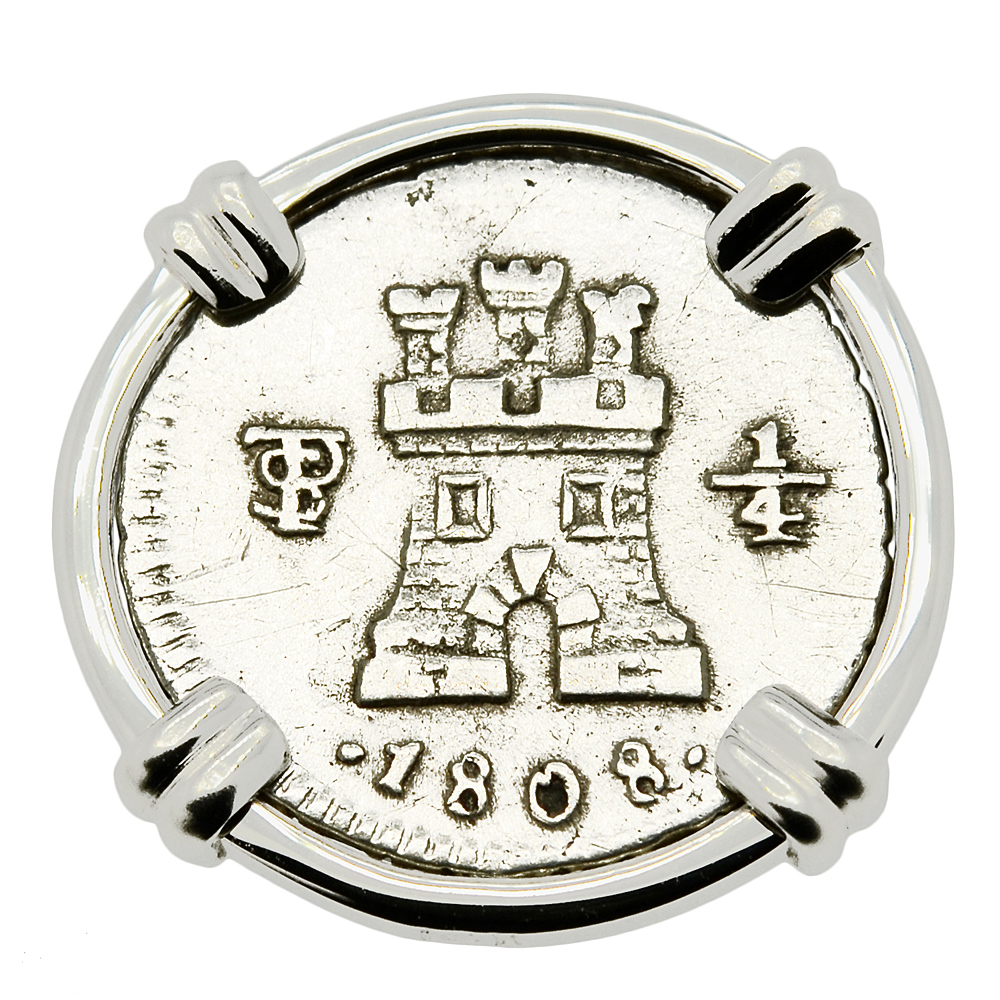 These are genuine Spanish silver coins that were minted in the colonial South American mint of Potosi, Peru. The obverse features a castle with the 1808 date, and the reverse shows a crowned rampant lion. In 1533, four decades after Columbus landed in the New World, Spanish conquistador Francisco Pizarro conquered the Inca Empire in Peru. Soon after, high in the Andes Mountains at Potosi, the Spanish discovered the richest silver deposits in the world and in 1575, they opened the Potosi mint.