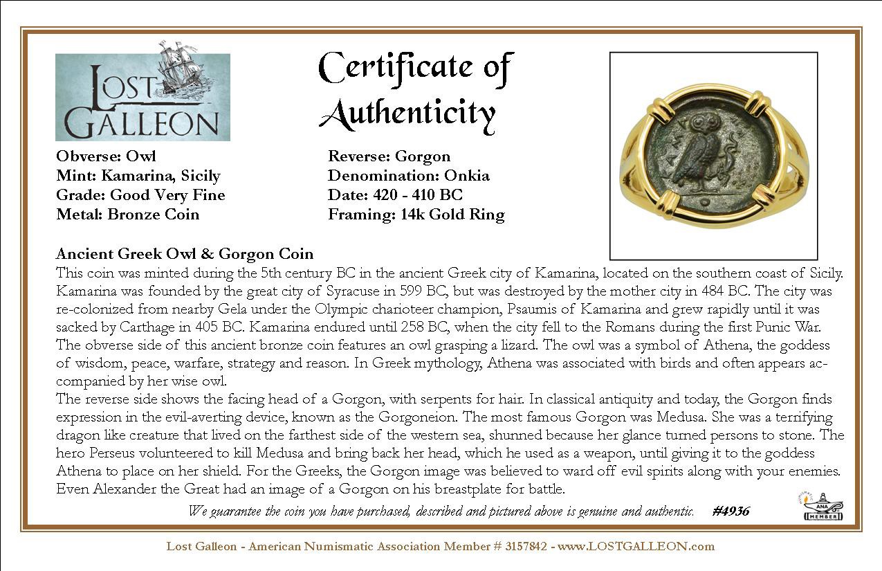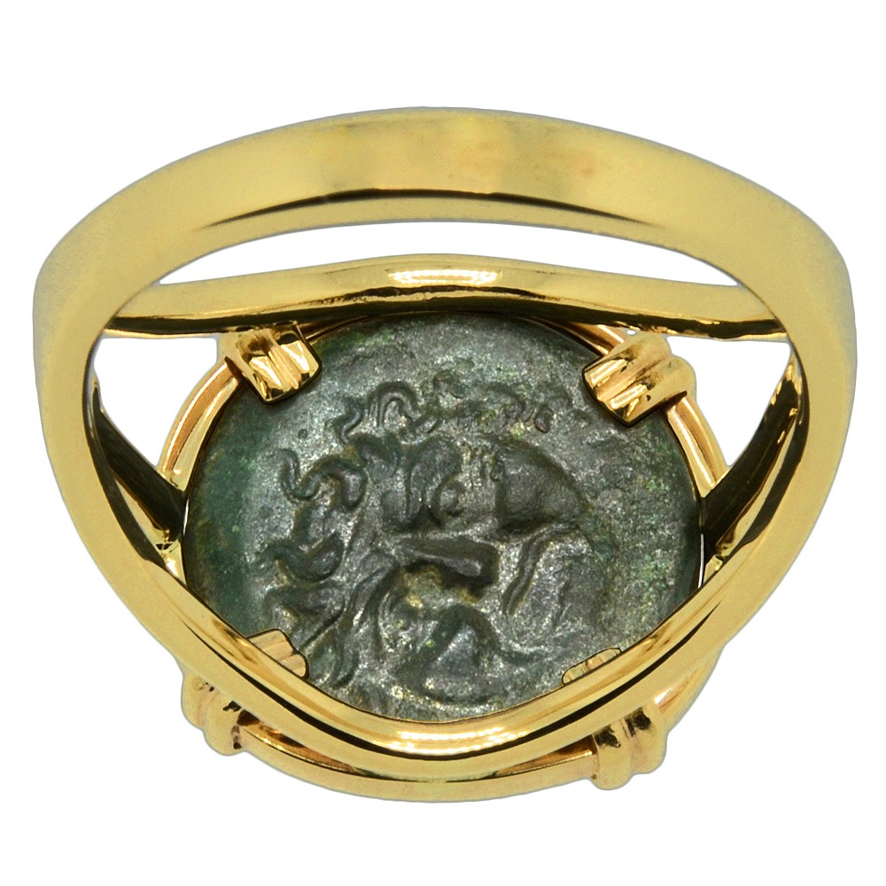 The reverse side shows the facing head of a Gorgon, with serpents for hair. In classical antiquity and today, the Gorgon finds expression in the evil-averting device, known as the Gorgoneion. The most famous Gorgon was Medusa. She was a terrifying dragon like creature that lived on the farthest side of the western sea, shunned because her glance turned persons to stone. The hero Perseus volunteered to kill Medusa and bring back her head, which he used as a weapon, until giving it to the goddess Athena to place on her shield. For the Greeks, the Gorgon image was believed to ward off evil spirits along with your enemies. Even Alexander the Great had an image of a Gorgon on his breastplate for battle.