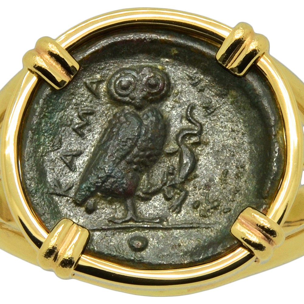 The obverse side of this ancient bronze coin features an owl grasping a lizard. The owl was a symbol of Athena, the goddess of wisdom, peace, warfare, strategy and reason. In Greek mythology, Athena was associated with birds and often appears accompanied by her wise owl.