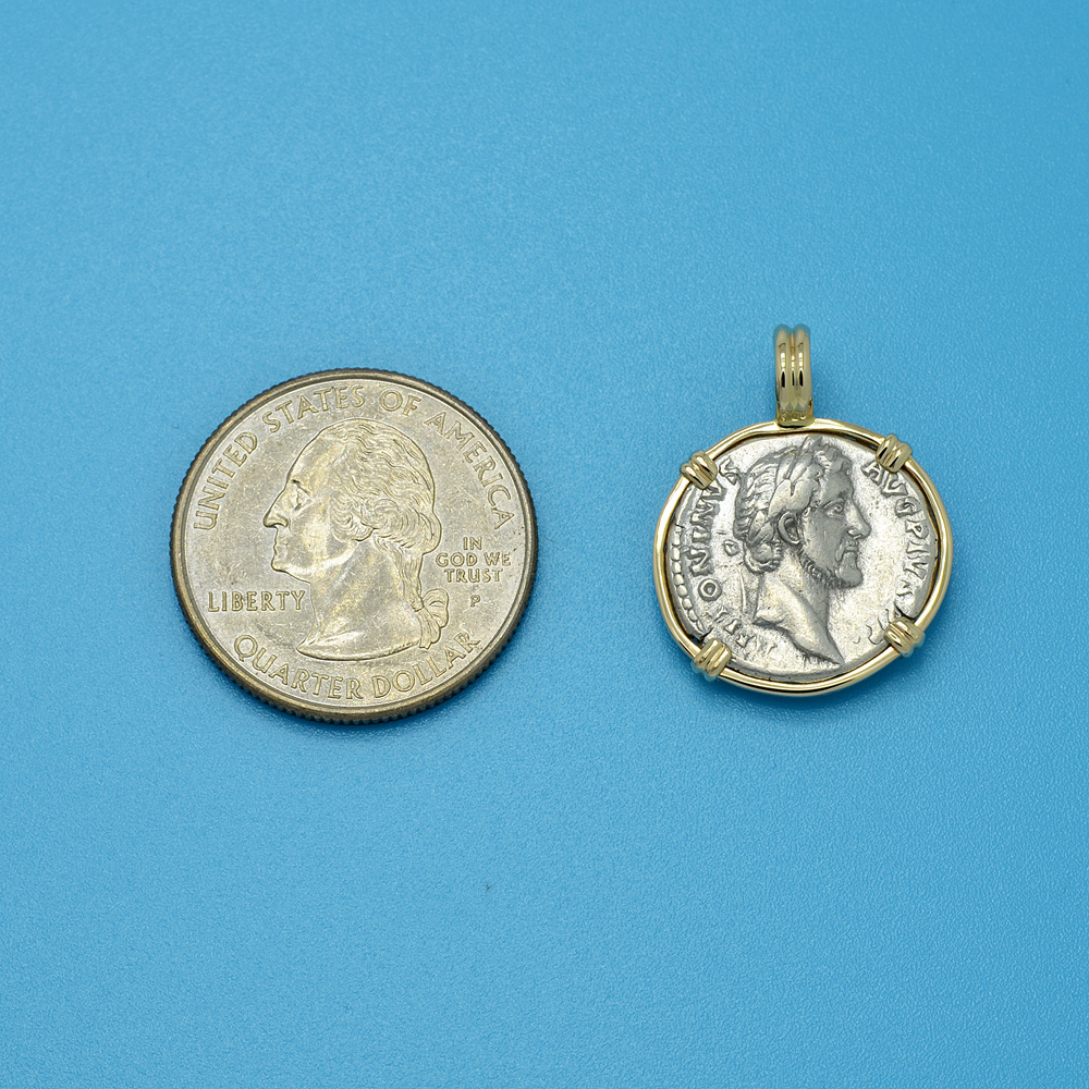 This denarius coin was minted during the rule of Antoninus Pius, who was Roman Emperor from AD 138 to 161. He was given the name Pius due to his insistence that the senate deify his adoptive father, the previous emperor, Hadrian. His reign was one of the most peaceful in the history of the empire, with no major incursions or revolts taking place.