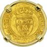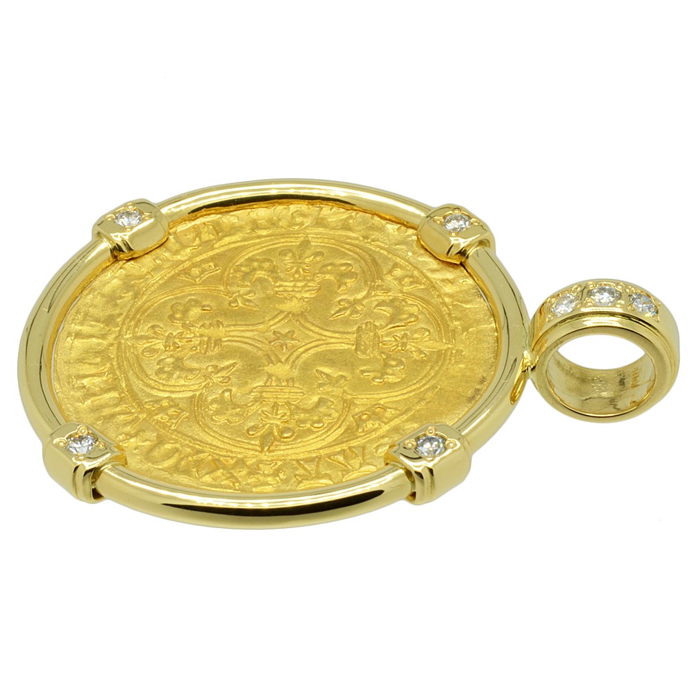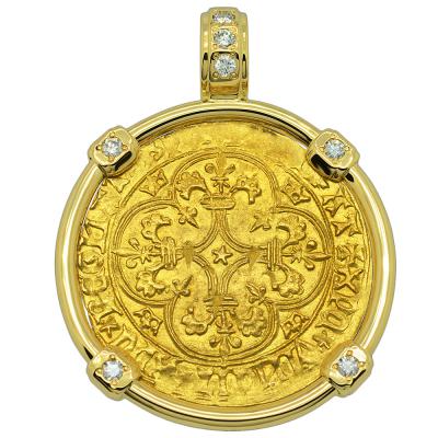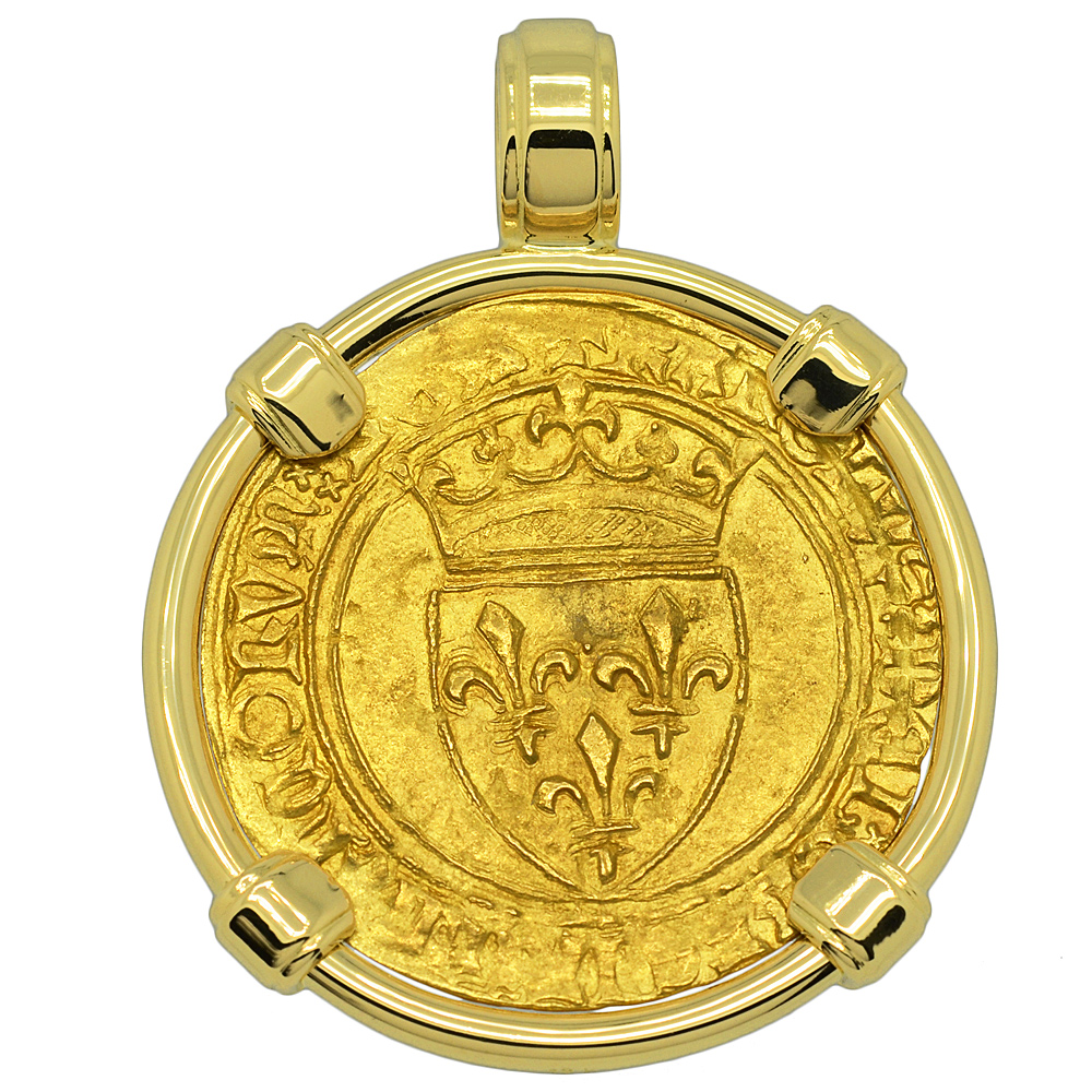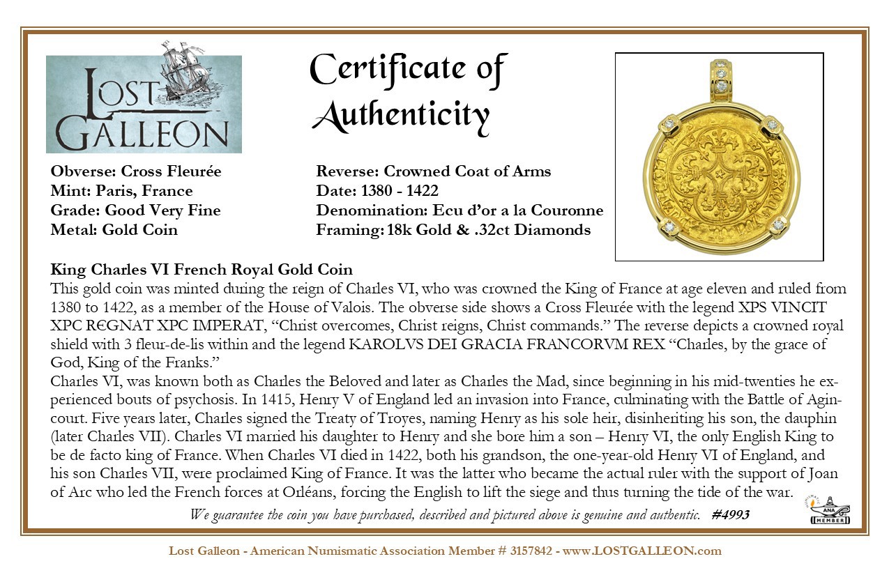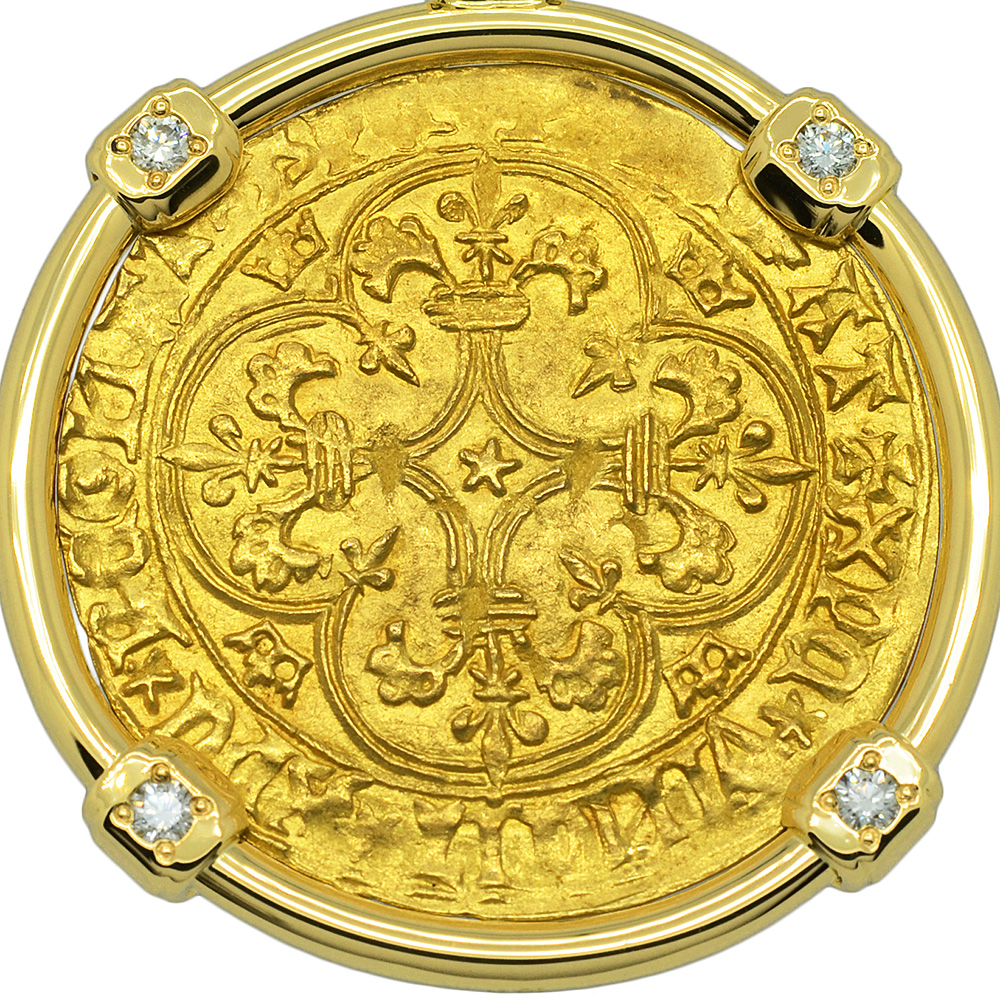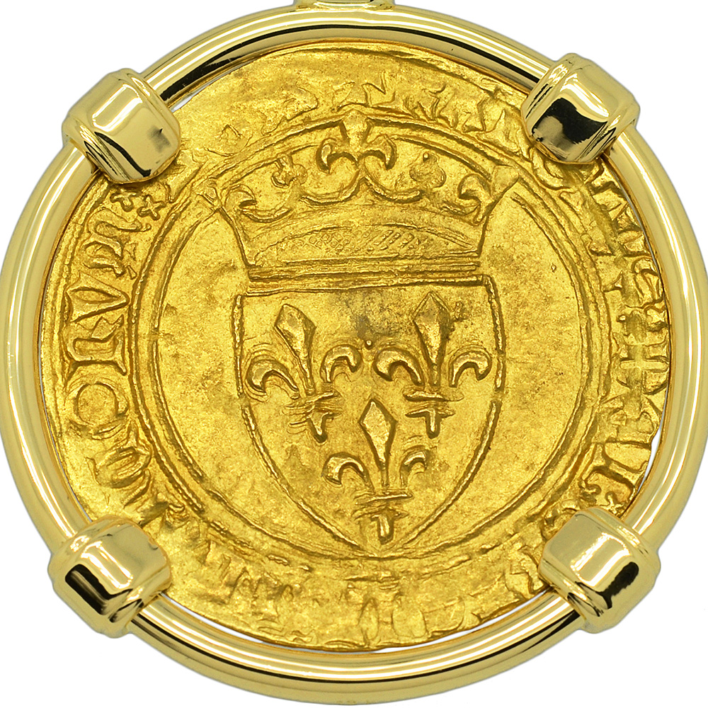 This gold coin was minted during the reign of Charles VI, who was crowned the King of France at age eleven and ruled from 1380 to 1422, as a member of the House of Valois. The obverse side shows a Cross Fleurée with the legend XPS VINCIT XPC RЄGNAT XPC IMPERAT, “ Christ overcomes, Christ reigns, Christ commands.” The reverse depicts a crowned royal shield with 3 fleur-de-lis within and the legend KAROLVS DEI GRACIA FRANCORVM REX “Charles, by the grace of God, King of the Franks.”