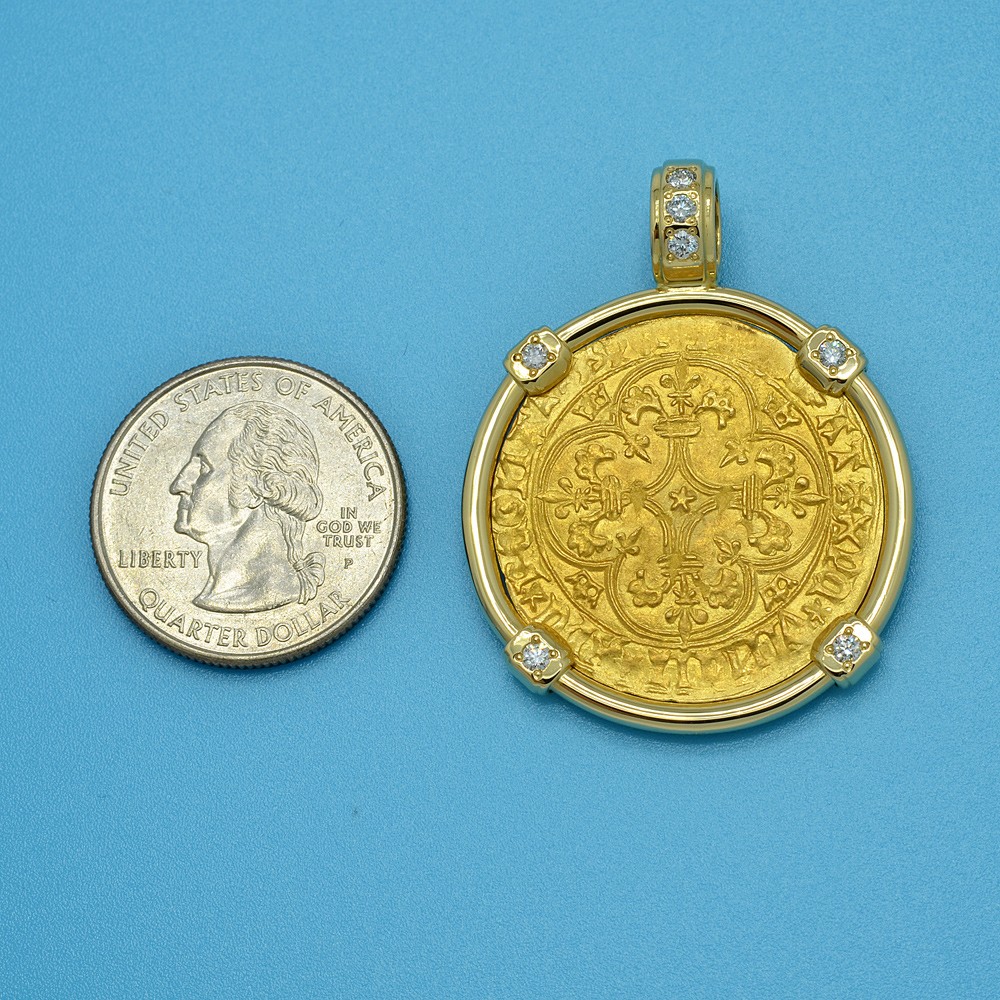 This gold coin was minted during the reign of Charles VI, who was crowned the King of France at age eleven and ruled from 1380 to 1422, as a member of the House of Valois. The obverse side shows a Cross Fleurée with the legend XPS VINCIT XPC RЄGNAT XPC IMPERAT, “ Christ overcomes, Christ reigns, Christ commands.” The reverse depicts a crowned royal shield with 3 fleur-de-lis within and the legend KAROLVS DEI GRACIA FRANCORVM REX “Charles, by the grace of God, King of the Franks.”