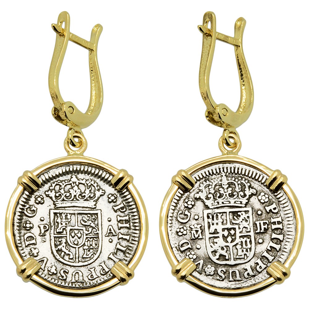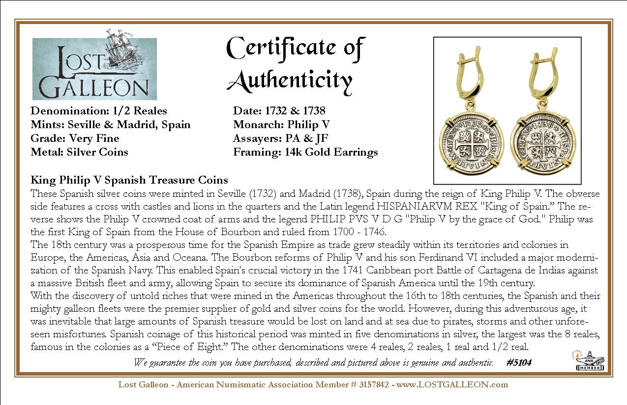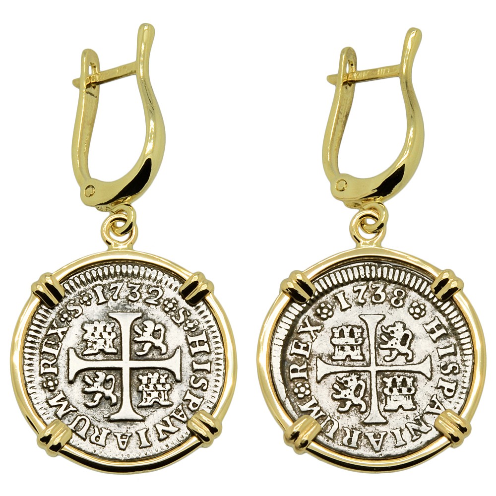 These Spanish silver coins were minted in Seville (1732) and Madrid (1738), Spain during the reign of King Philip V. The obverse side features a cross with castles and lions in the quarters and the Latin legend HISPANIARVM REX "King of Spain.” The reverse shows the Philip V crowned coat of arms and the legend PHILIP PVS V D G "Philip V by the grace of God." Philip was the first King of Spain from the House of Bourbon and ruled from 1700 - 1746.