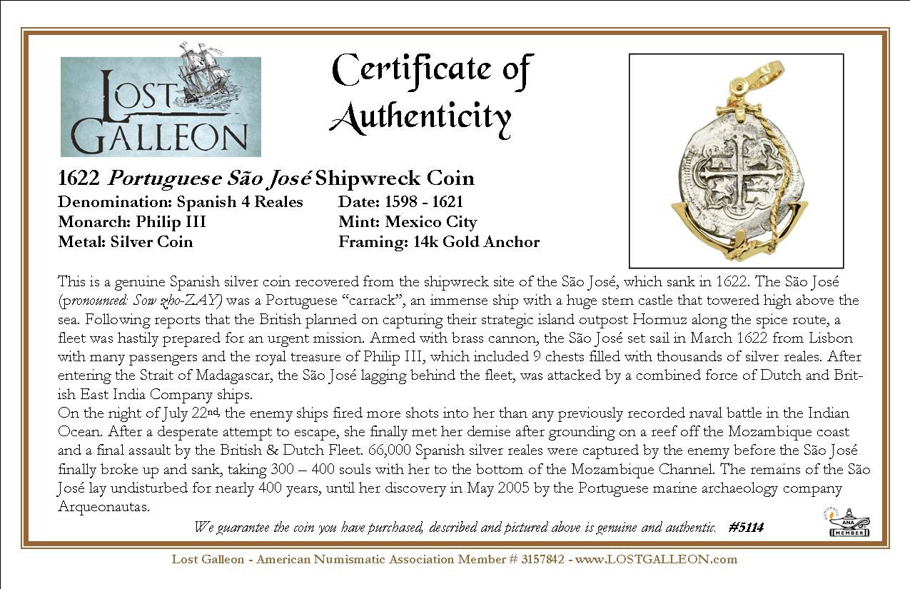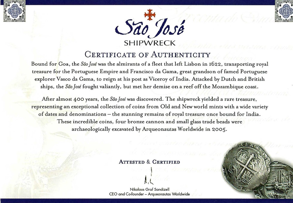 Arqueonautas salvagers certificate included. This is a genuine Spanish silver coin recovered from the shipwreck site of the São José, which sank in 1622. The São José (pronounced: Sow zho-ZAY) was a Portuguese “carrack”, an immense ship with a huge stern castle that towered high above the sea. Following reports that the British planned on capturing their strategic island outpost Hormuz along the spice route, a fleet was hastily prepared for an urgent mission. Armed with brass cannon, the São José set sail in March 1622 from Lisbon with many passengers and the royal treasure of Philip III, which included 9 chests filled with thousands of silver reales. After entering the Strait of Madagascar, the São José lagging behind the fleet, was attacked by a combined force of Dutch and British East India Company ships.