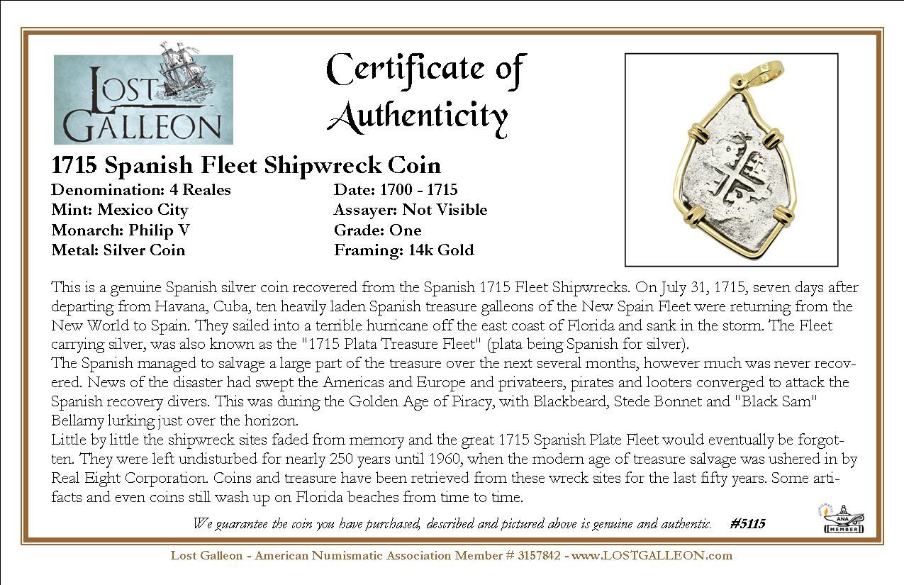 1715 Fleet shipwreck certificate also included. This is a genuine Spanish silver coin recovered from the Spanish 1715 Fleet Shipwrecks. On July 31, 1715, seven days after departing from Havana, Cuba, ten heavily laden Spanish treasure galleons of the New Spain Fleet were returning from the New World to Spain. They sailed into a terrible hurricane off the east coast of Florida and sank in the storm. The Fleet carrying silver, was also known as the "1715 Plata Treasure Fleet" (plata being Spanish for silver).