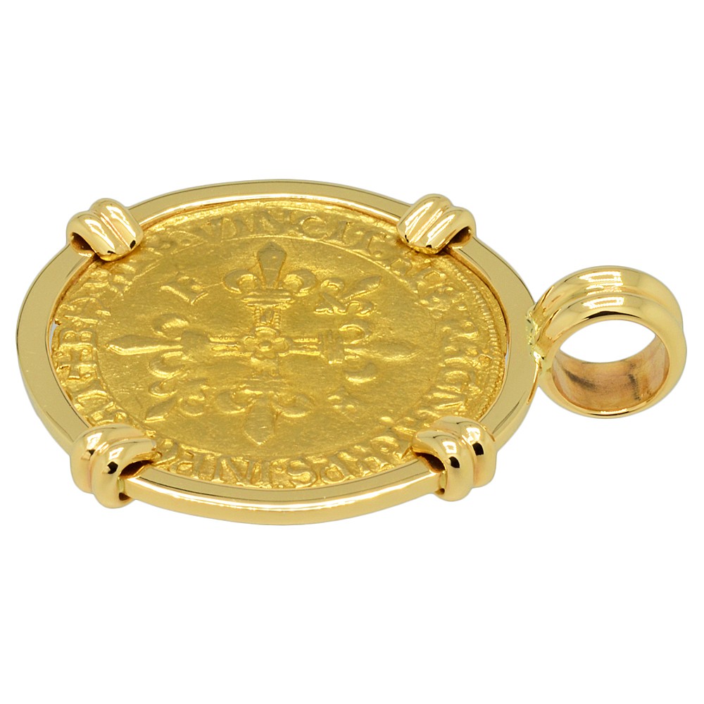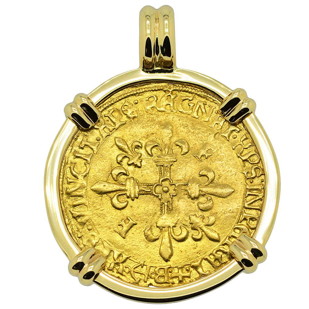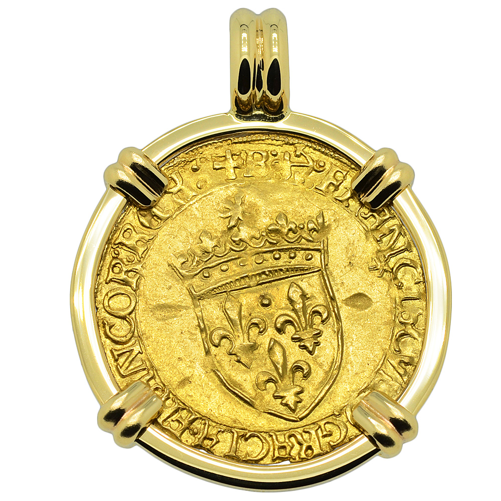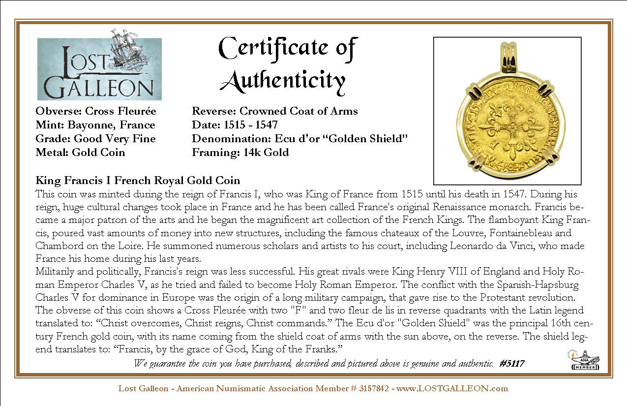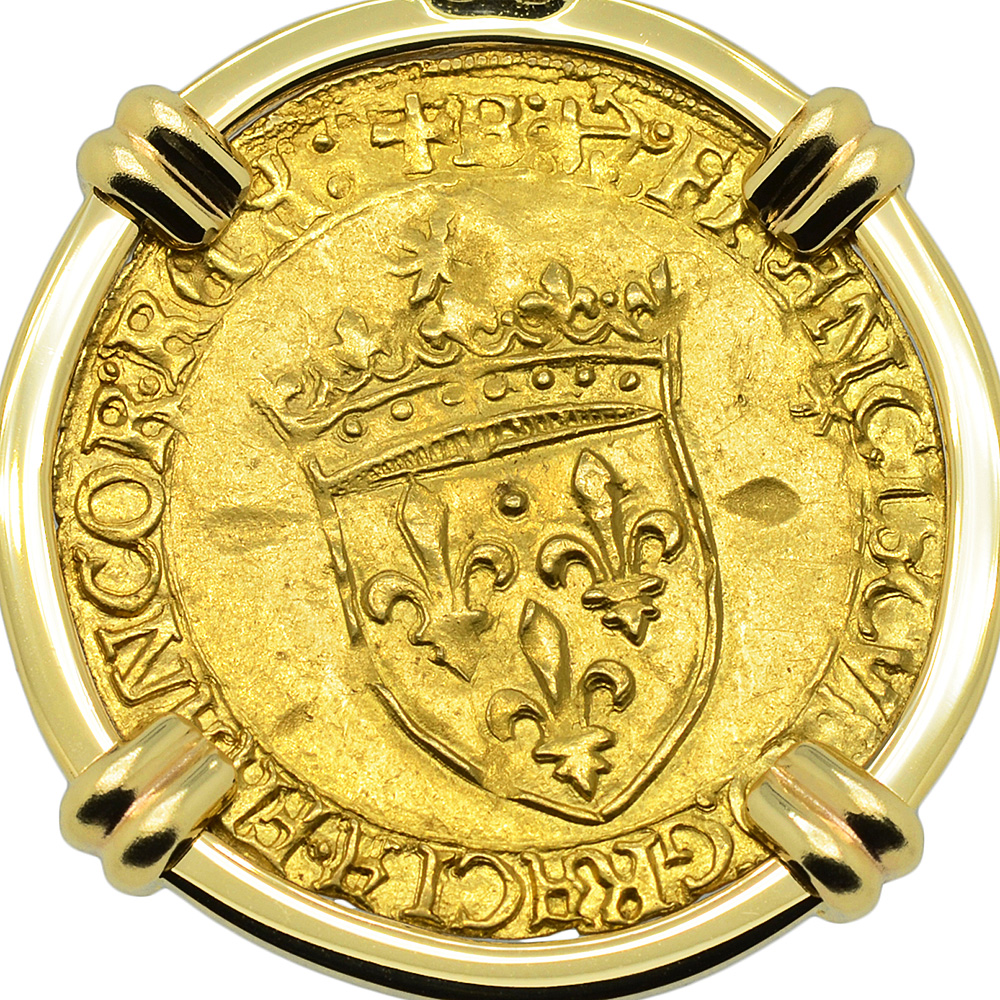 The obverse of this coin shows a Cross Fleurée with two "F" and two fleur de lis in reverse quadrants with the Latin legend translated to: “Christ overcomes, Christ reigns, Christ commands.” The Ecu d'or "Golden Shield" was the principal 16th century French gold coin, with its name coming from the shield coat of arms with the sun above, on the reverse. The shield legend translates to: “Francis, by the grace of God, King of the Franks.”