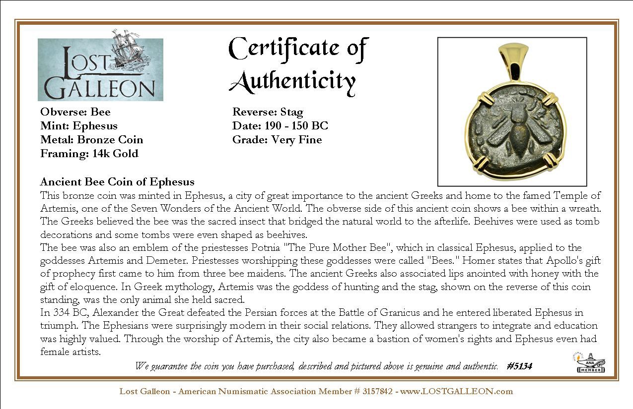 The bee was also an emblem of the priestesses Potnia "The Pure Mother Bee", which in classical Ephesus, applied to the goddesses Artemis and Demeter. Priestesses worshipping these goddesses were called "Bees." Homer states that Apollo's gift of prophecy first came to him from three bee maidens. The ancient Greeks also associated lips anointed with honey with the gift of eloquence. In Greek mythology, Artemis was the goddess of hunting and the stag, shown on the reverse of this coin standing, was the only animal she held sacred.