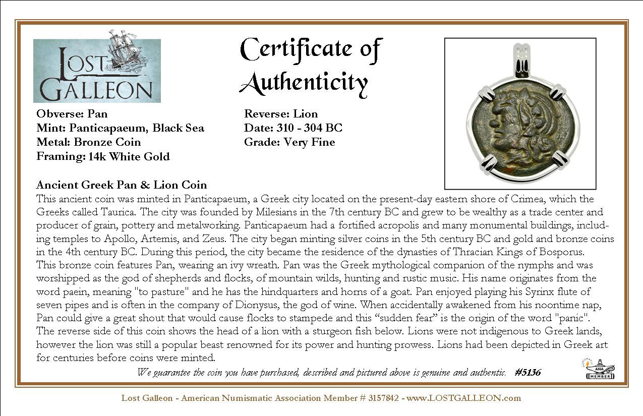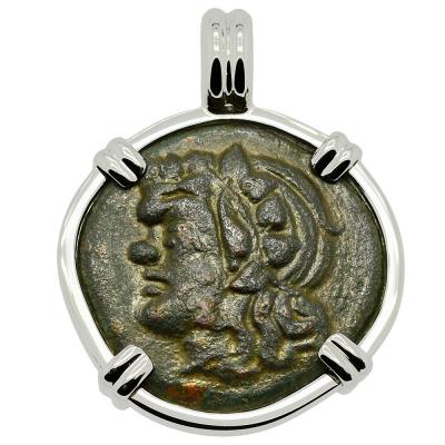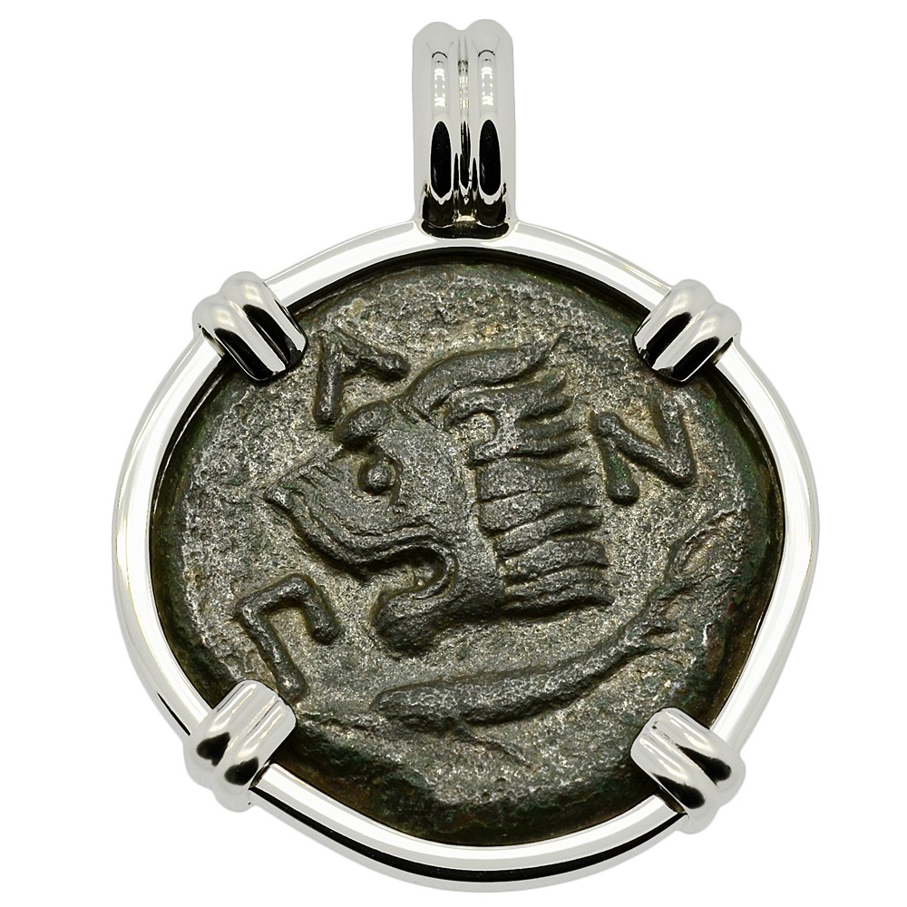 This bronze coin features Pan, wearing an ivy wreath. Pan was the Greek mythological companion of the nymphs and was worshipped as the god of shepherds and flocks, of mountain wilds, hunting and rustic music. His name originates from the word paein, meaning "to pasture" and he has the hindquarters and horns of a goat. Pan enjoyed playing his Syrinx flute of seven pipes and is often in the company of Dionysus, the god of wine. When accidentally awakened from his noontime nap, Pan could give a great shout that would cause flocks to stampede and this “sudden fear” is the origin of the word "panic".