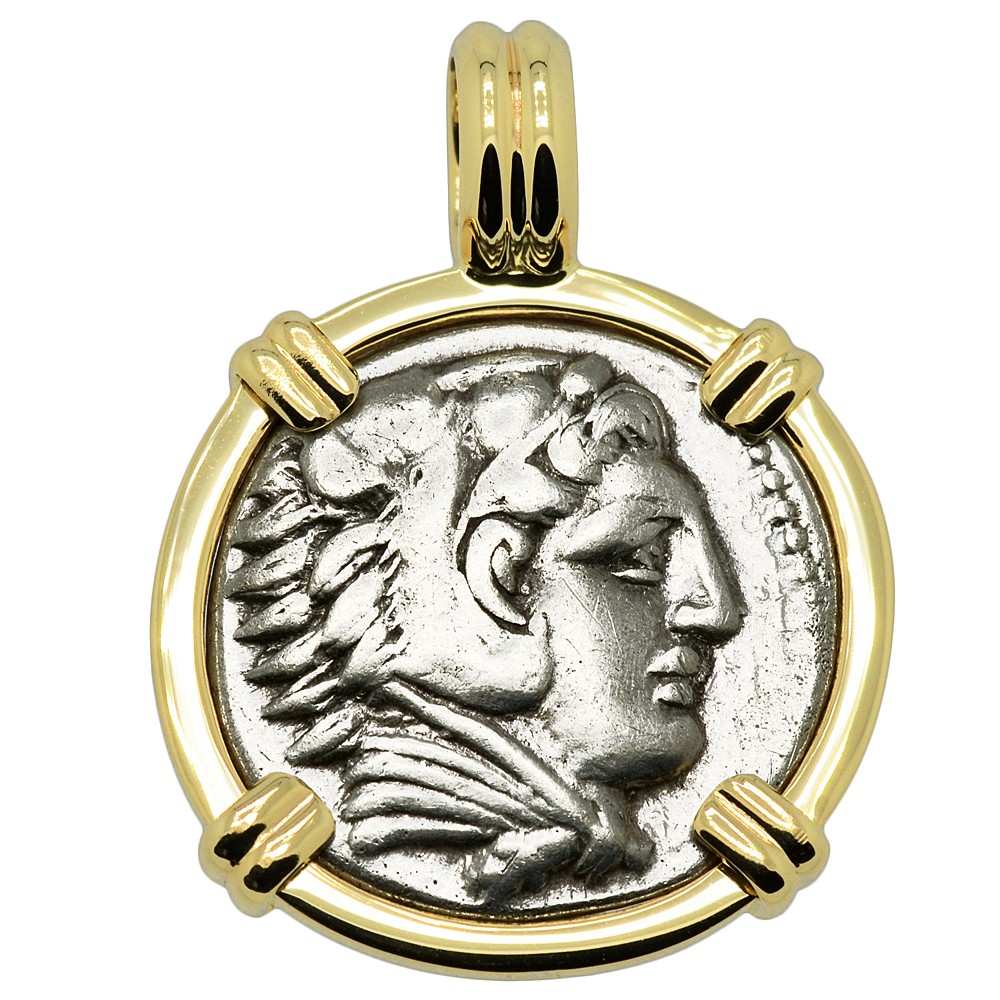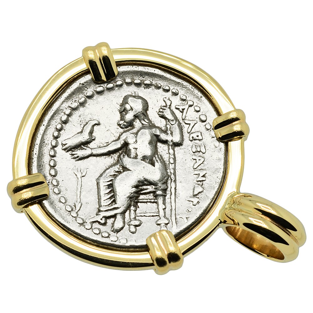 The obverse of this coin, shows the Greek hero Hercules wearing a lion’s skin of armor. This was important to Alexander's hereditary line as he claimed to be descended from the mythological hero. The reverse shows Zeus, the king of the Greek gods, seated on a throne and holding an eagle. Zeus was the most powerful of all the Greek gods and his appearance on Alexander's coinage symbolized Alexander's status as leader of all the Greeks.