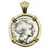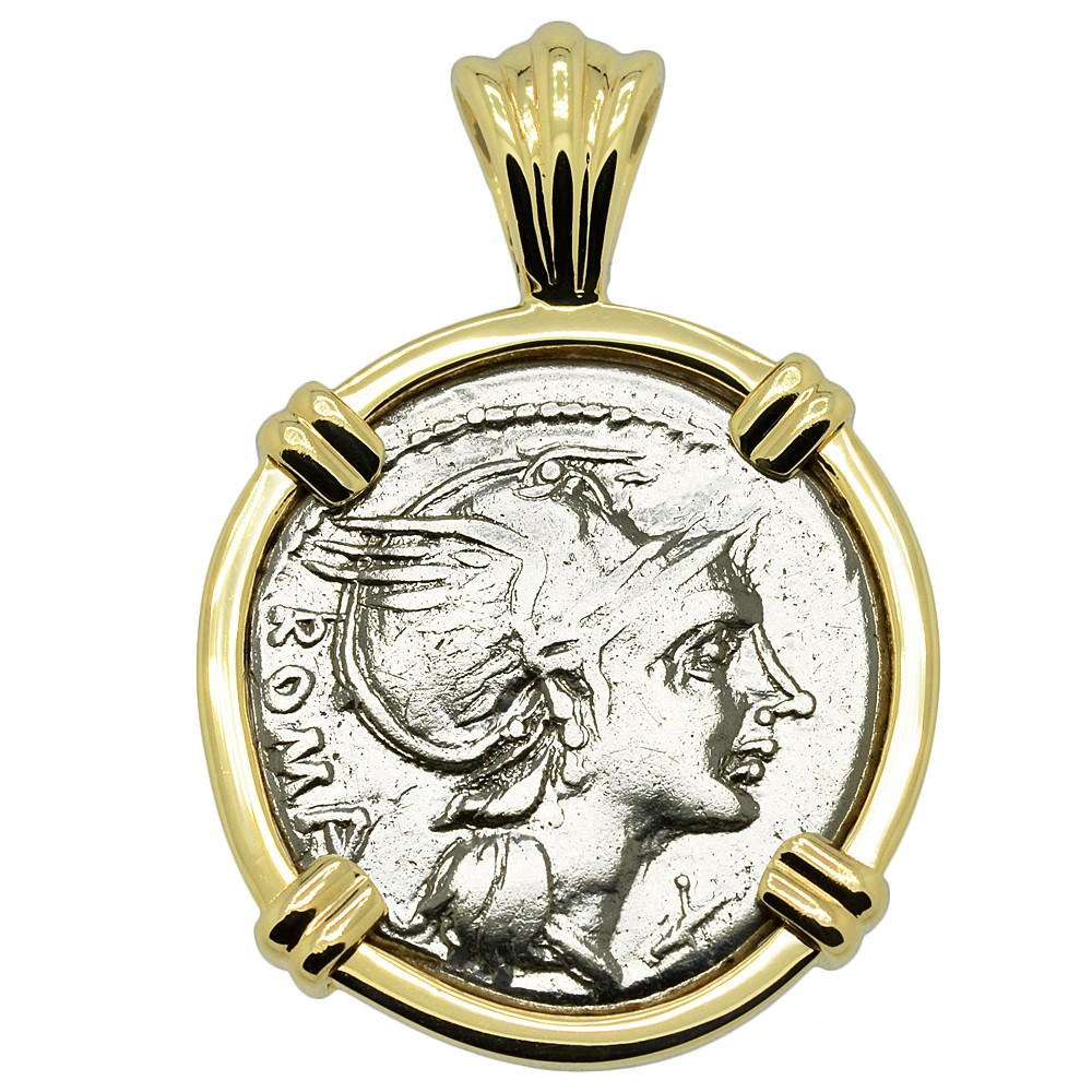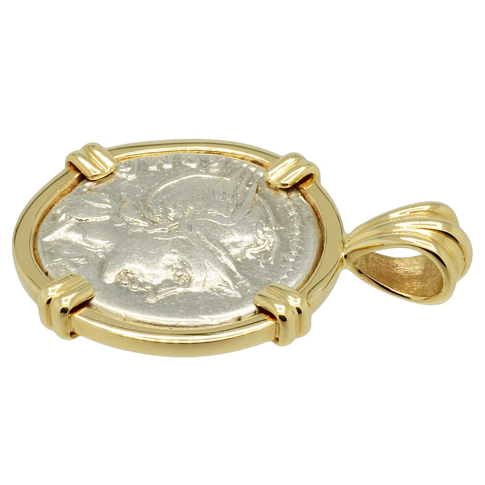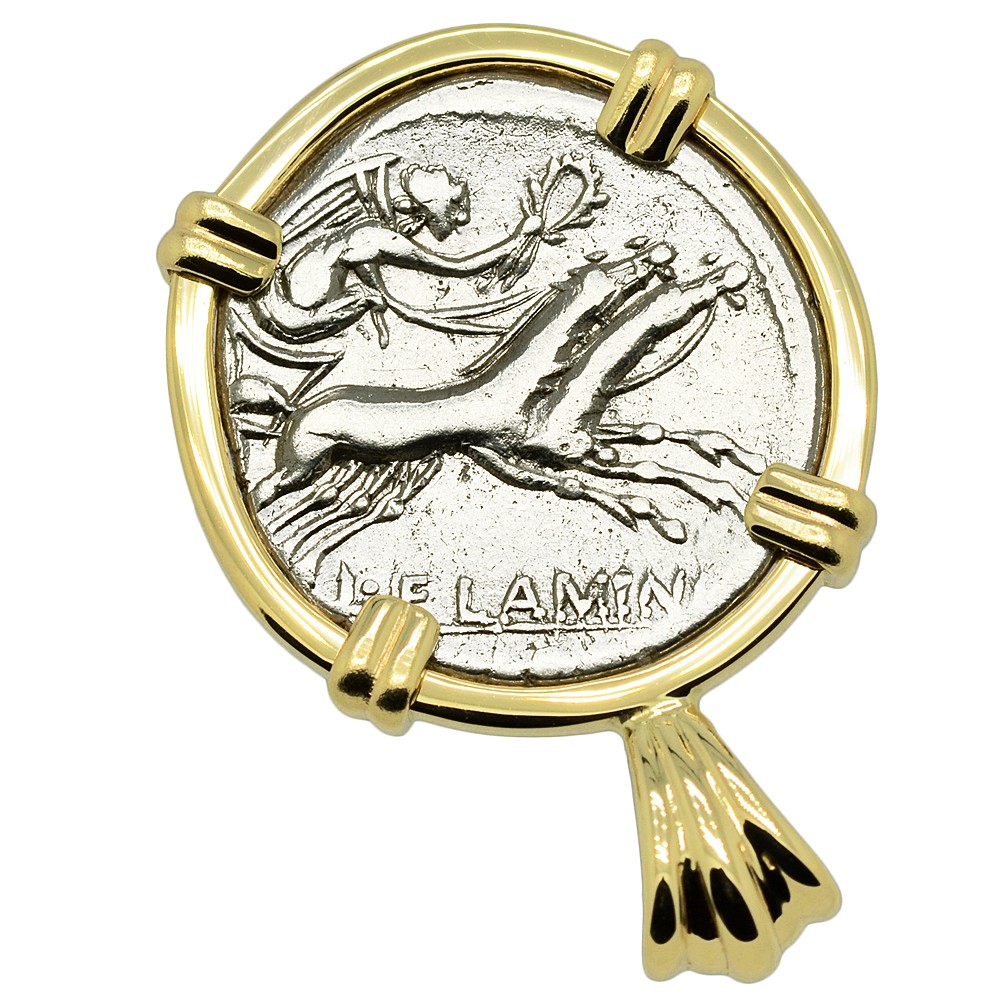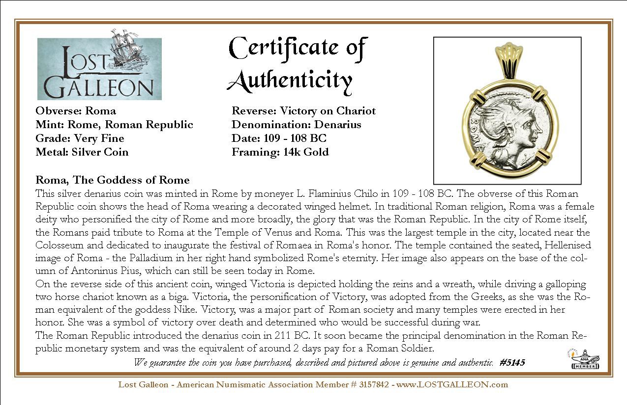 This silver denarius coin was minted in Rome by moneyer L. Flaminius Chilo in 109 - 108 BC. The obverse of this Roman Republic coin shows the head of Roma wearing a decorated winged helmet. In traditional Roman religion, Roma was a female deity who personified the city of Rome and more broadly, the glory that was the Roman Republic. In the city of Rome itself, the Romans paid tribute to Roma at the Temple of Venus and Roma. This was the largest temple in the city, located near the Colosseum and dedicated to inaugurate the festival of Romaea in Roma's honor. The temple contained the seated, Hellenised image of Roma - the Palladium in her right hand symbolized Rome's eternity. Her image also appears on the base of the column of Antoninus Pius, which can still be seen today in Rome.