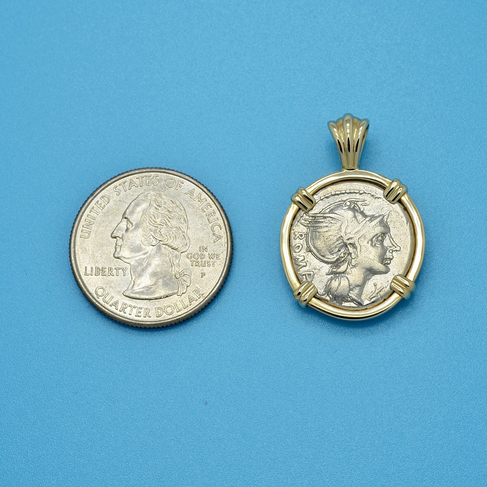 The Roman Republic introduced the denarius coin in 211 BC. It soon became the principal denomination in the Roman Republic monetary system and was the equivalent of around 2 days pay for a Roman Soldier.