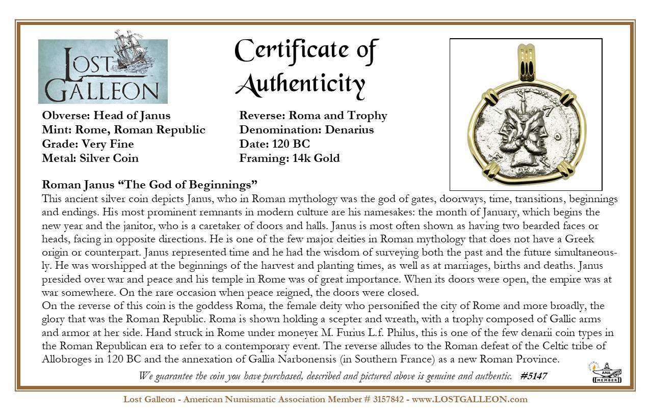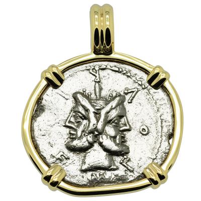 This ancient silver coin depicts Janus, who in Roman mythology was the god of gates, doorways, time, transitions, beginnings and endings. His most prominent remnants in modern culture are his namesakes: the month of January, which begins the new year and the janitor, who is a caretaker of doors and halls. Janus is most often shown as having two bearded faces or heads, facing in opposite directions. He is one of the few major deities in Roman mythology that does not have a Greek origin or counterpart.