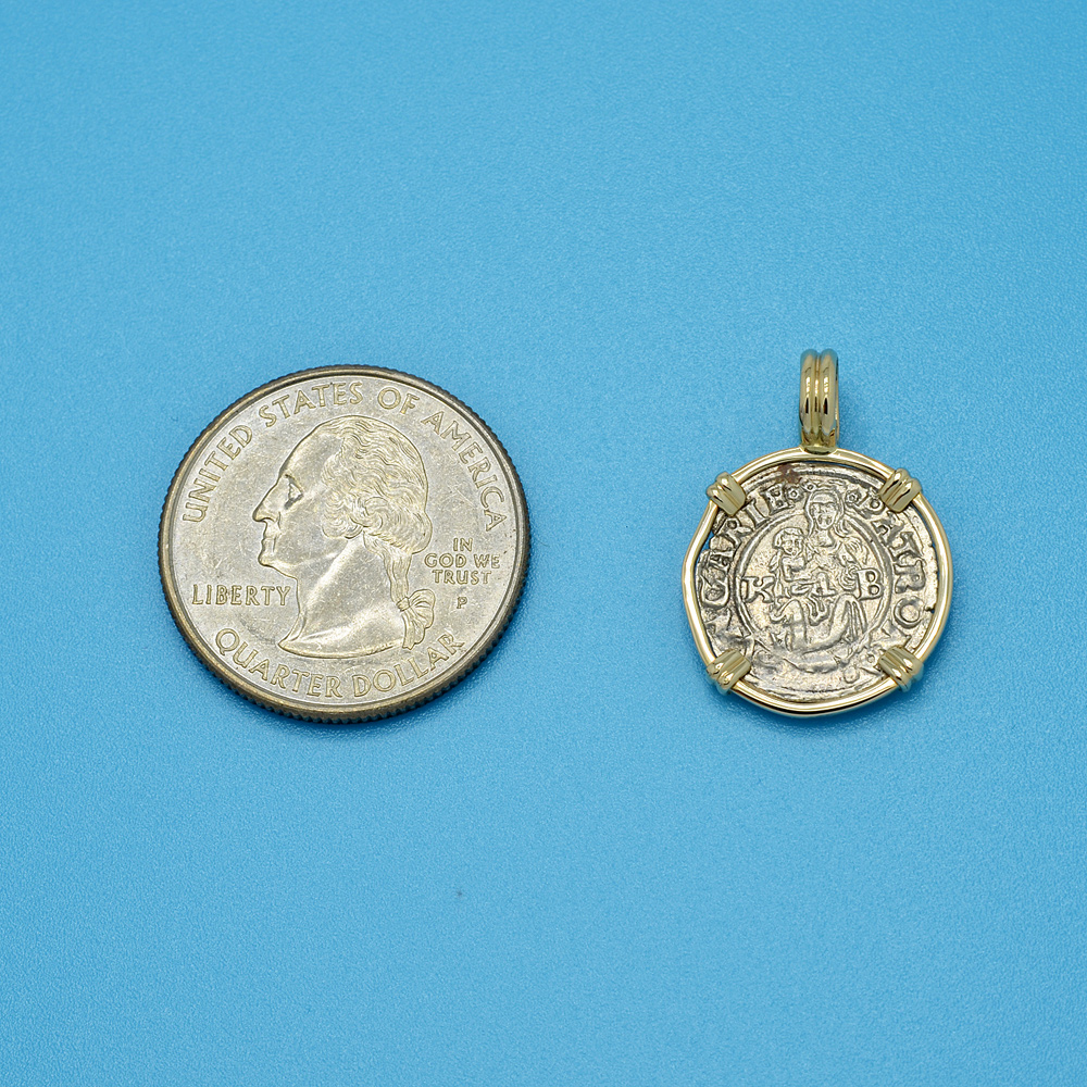 The image of the Madonna and Child featured on this coin is a representation of Mary, mother of Jesus, with the infant Jesus. These images are central icons of Roman Catholicism and Eastern Orthodox Christianity, with the first such images dating to the early Christian Church, which were found in the catacombs of Rome. For over a thousand years, through the Byzantine, Medieval and early Renaissance Periods, the Madonna was the most often produced pictorial artwork.