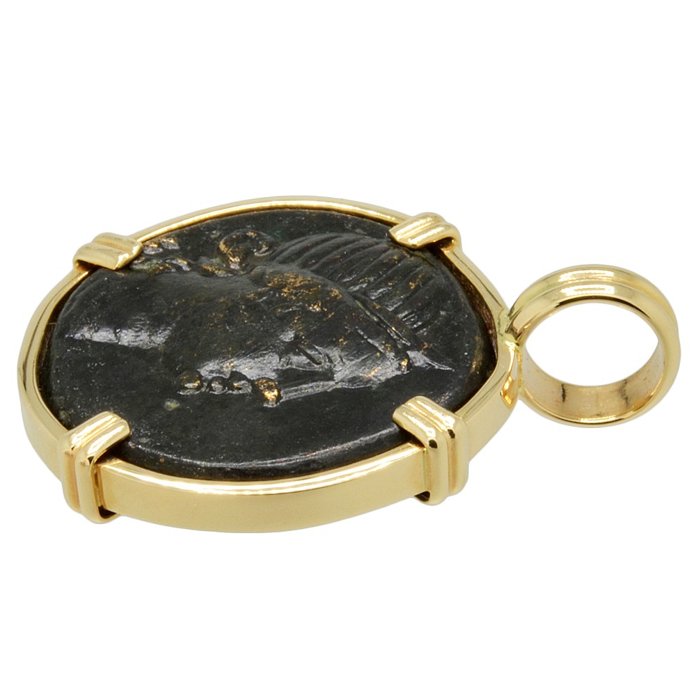 Artemis is shown on this coin as the huntress, carrying her quiver of arrows over her shoulder. In Greek mythology, the Olympian Goddess Artemis was the daughter of Zeus and twin sister of Apollo and one of the most widely admired and worshiped of all the ancient Greek deities. She was the goddess of hunting which encompassed all wildlife and her favorite hunting companion was Orion. Artemis was also the goddess of all women, with a particular focus on childbirth. In the city of Ephesus, she was worshiped at the Temple of Artemis, one of the Seven Wonders of the Ancient World. The reverse of this coin depicts a tripod, which the ancient Greeks used for trophies, sacrificial altars or cauldrons.