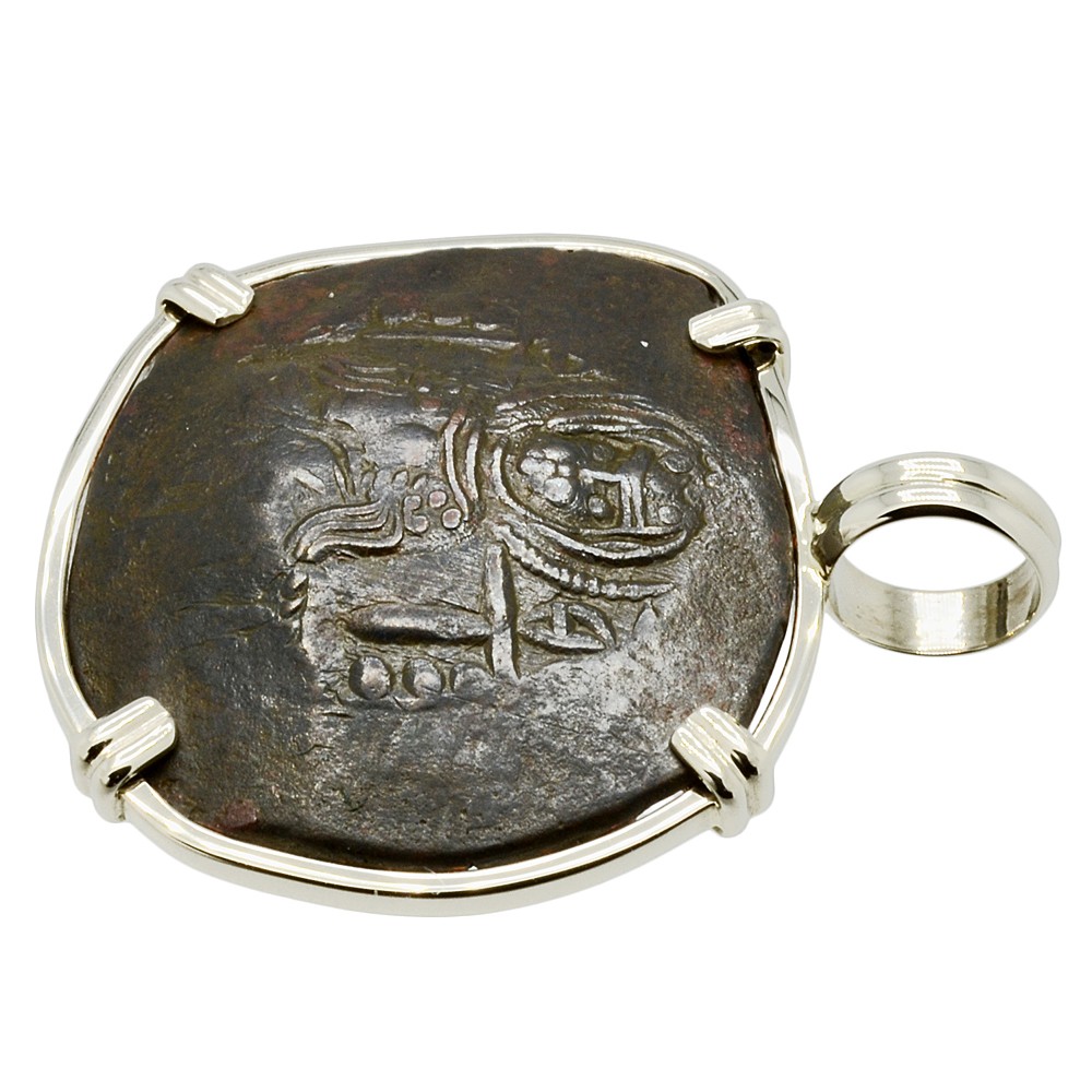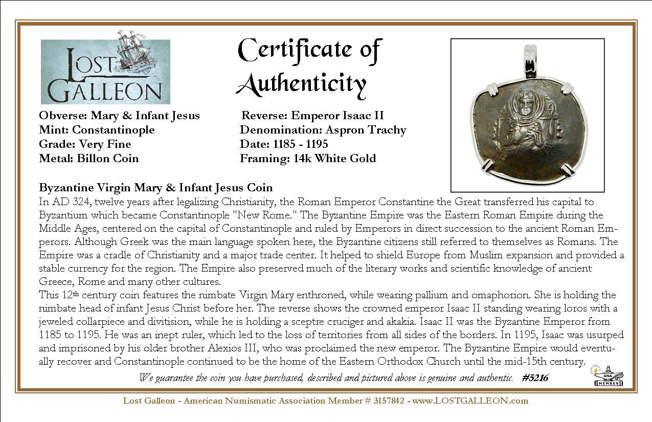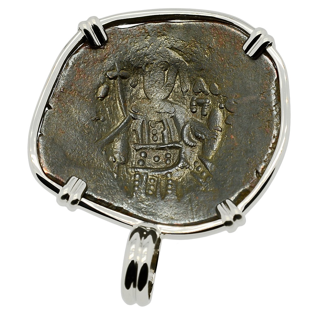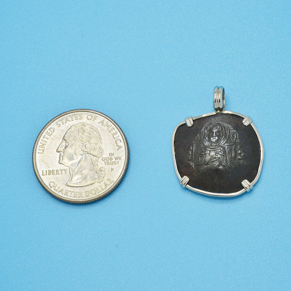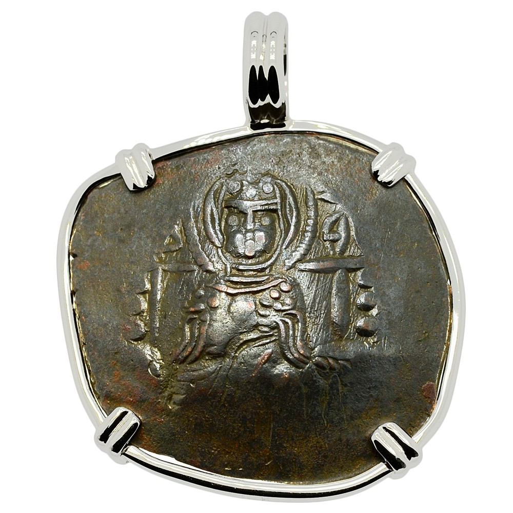 This 12th century coin features the nimbate Virgin Mary enthroned, while wearing pallium and omaphorion. She is holding the nimbate head of infant Jesus Christ before her. The reverse shows the crowned emperor Isaac II standing wearing loros with a jeweled collarpiece and divitision, while he is holding a sceptre cruciger and akakia. Isaac II was the Byzantine Emperor from 1185 to 1195. He was an inept ruler, which led to the loss of territories from all sides of the borders. In 1195, Isaac was usurped and imprisoned by his older brother Alexios III, who was proclaimed the new emperor. The Byzantine Empire would eventually recover and Constantinople continued to be the home of the Eastern Orthodox Church until the mid-15th century.
