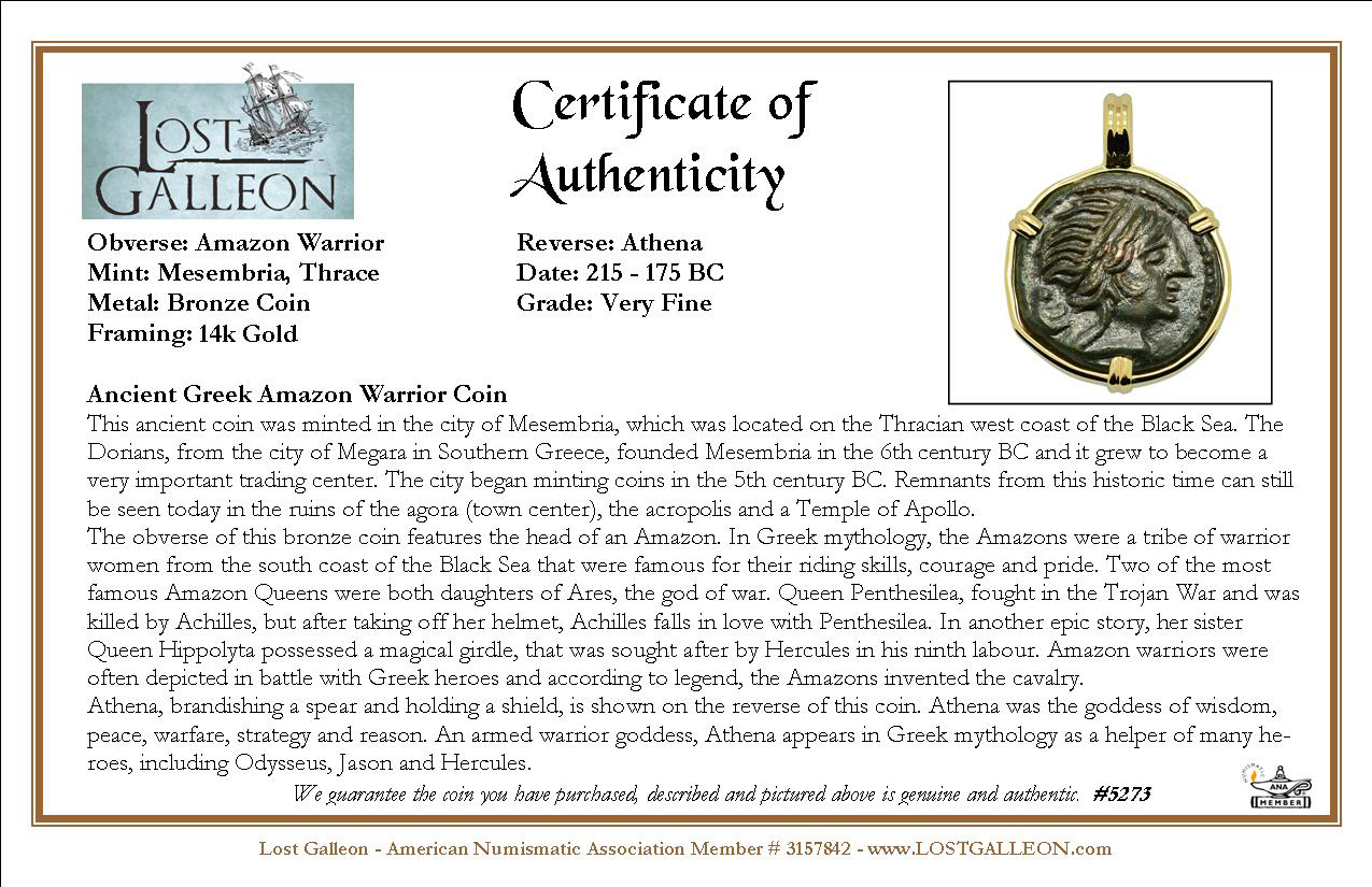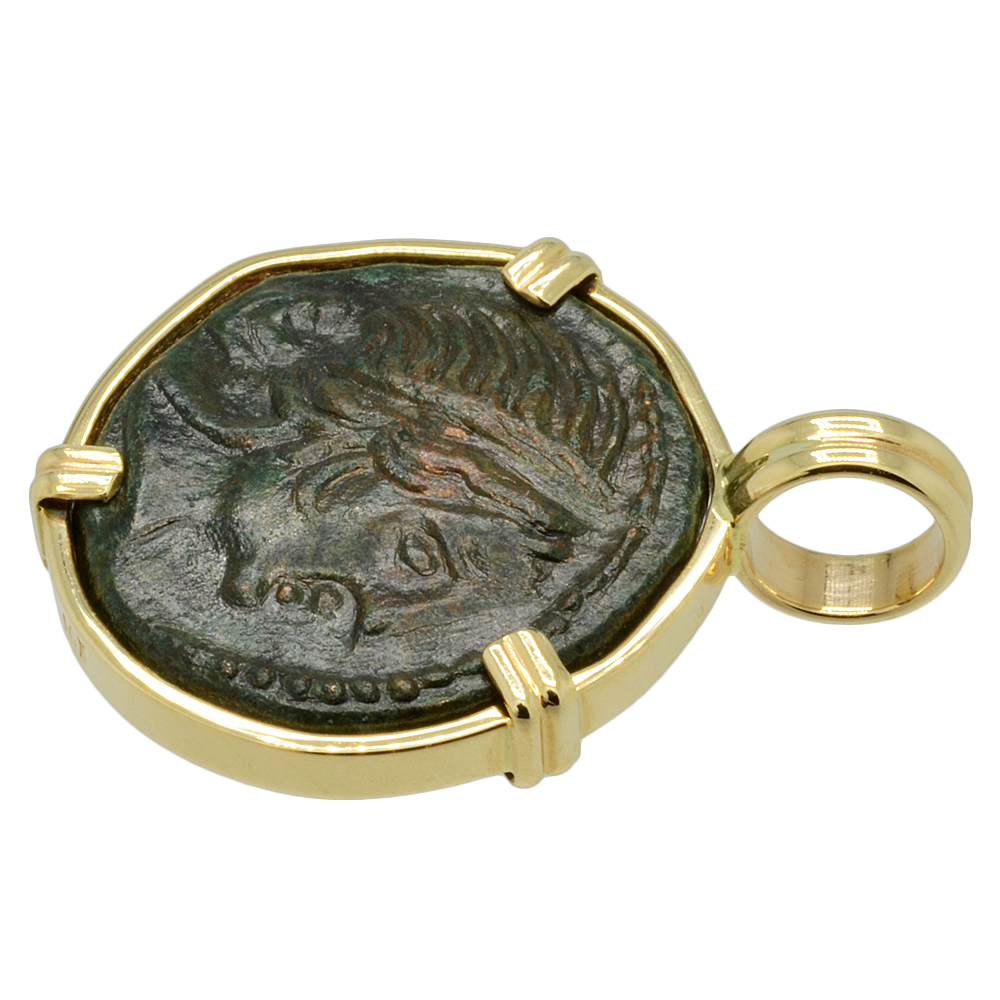 The obverse of this bronze coin features the head of an Amazon. In Greek mythology, the Amazons were a tribe of warrior women from the south coast of the Black Sea that were famous for their riding skills, courage and pride. Two of the most famous Amazon Queens were both daughters of Ares, the god of war. Queen Penthesilea, fought in the Trojan War and was killed by Achilles, but after taking off her helmet, Achilles falls in love with Penthesilea. In another epic story, her sister Queen Hippolyta possessed a magical girdle, that was sought after by Hercules in his ninth labour. Amazon warriors were often depicted in battle with Greek heroes and according to legend, the Amazons invented the cavalry.