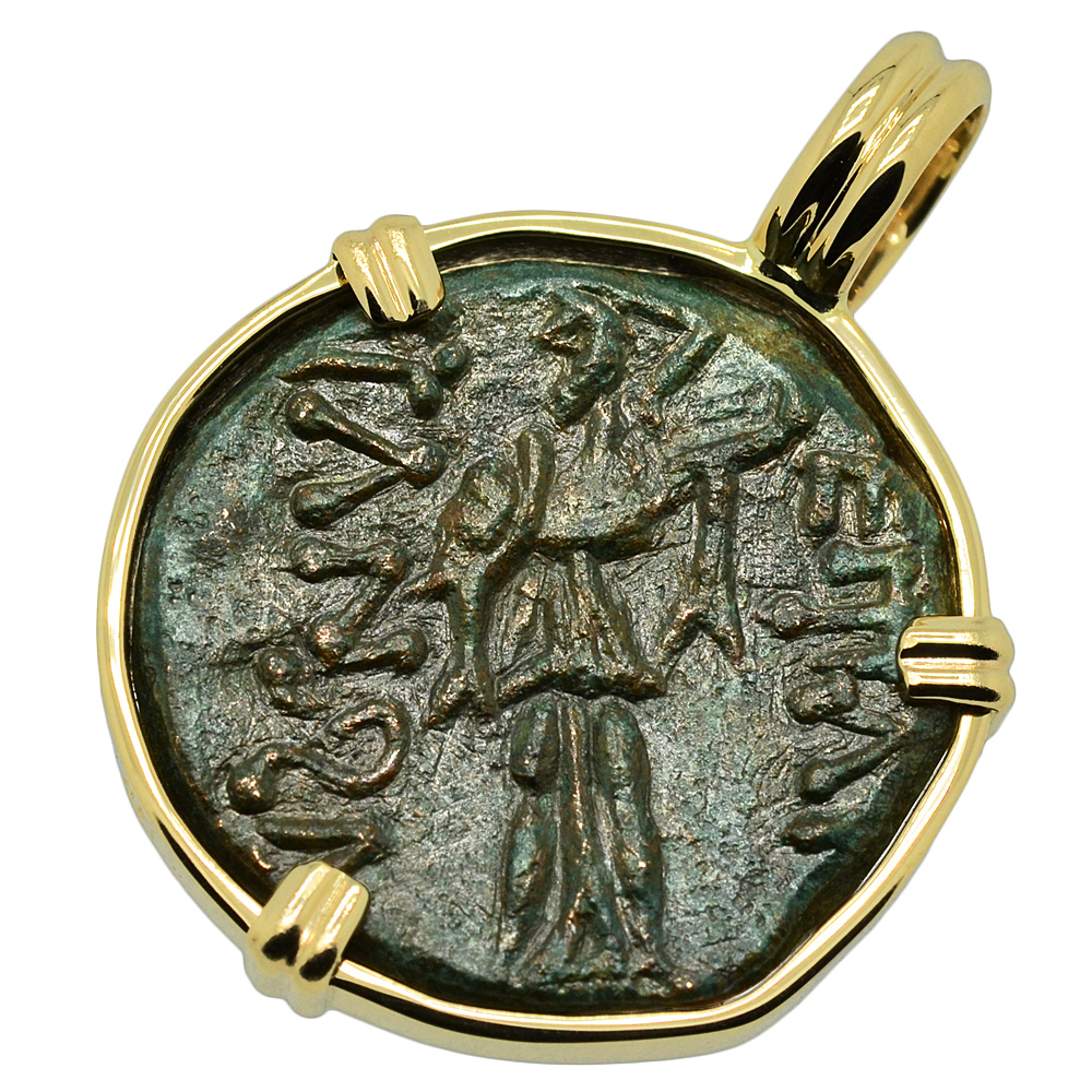 Athena, brandishing a spear and holding a shield, is shown on the reverse of this coin. Athena was the goddess of wisdom, peace, warfare, strategy and reason. An armed warrior goddess, Athena appears in Greek mythology as a helper of many heroes, including Odysseus, Jason and Hercules.