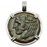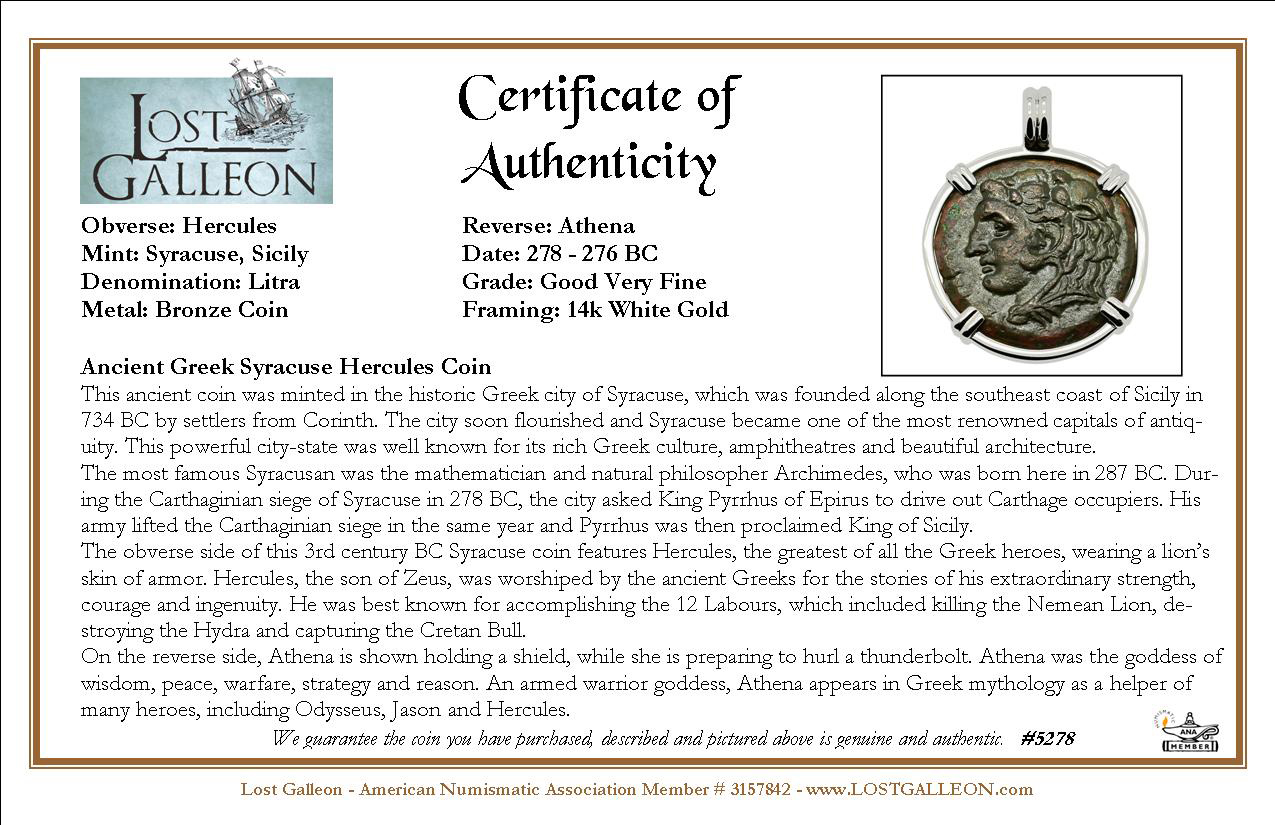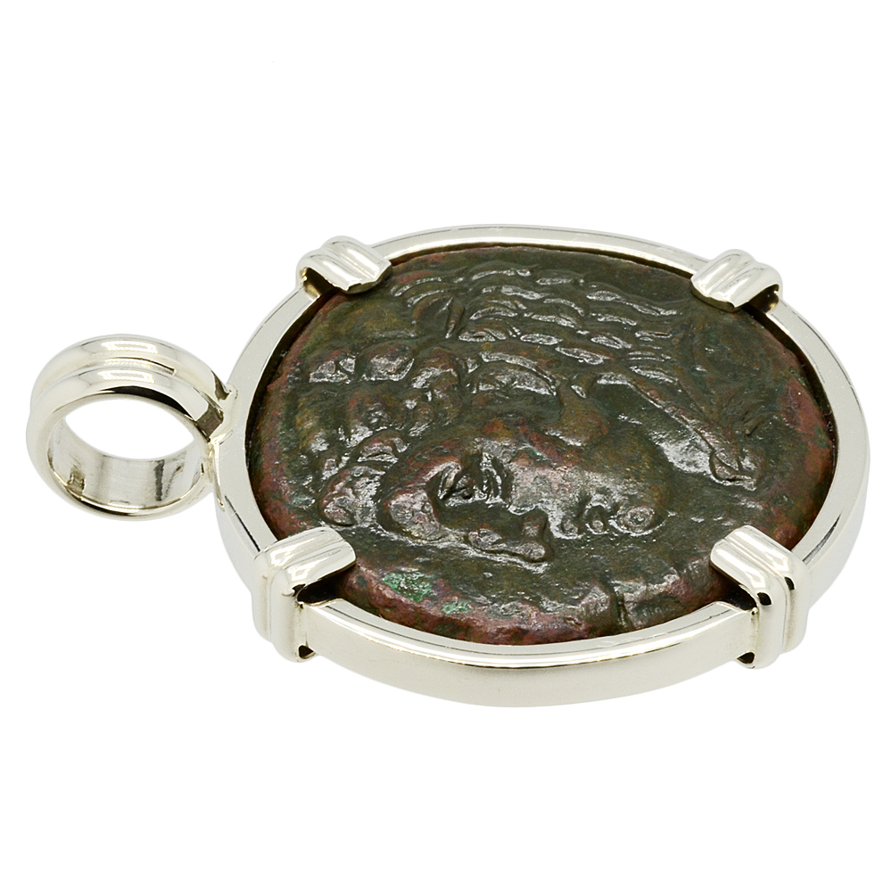 The obverse side of this 3rd century BC Syracuse coin features Hercules, the greatest of all the Greek heroes, wearing a lion’s skin of armor. Hercules, the son of Zeus, was worshiped by the ancient Greeks for the stories of his extraordinary strength, courage and ingenuity. He was best known for accomplishing the 12 Labours, which included killing the Nemean Lion, destroying the Hydra and capturing the Cretan Bull.