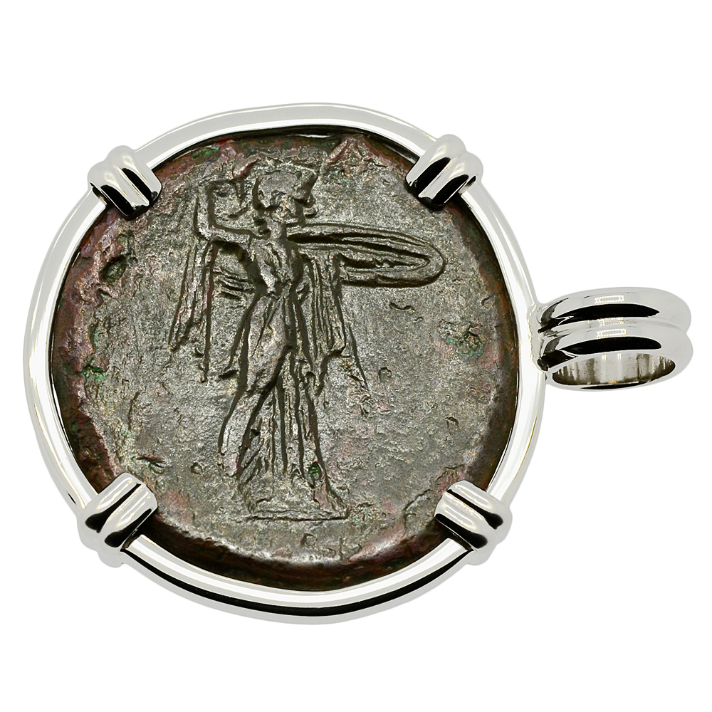 On the reverse side, Athena is shown holding a shield, while she is preparing to hurl a thunderbolt. Athena was the goddess of wisdom, peace, warfare, strategy and reason. An armed warrior goddess, Athena appears in Greek mythology as a helper of many heroes, including Odysseus, Jason and Hercules.