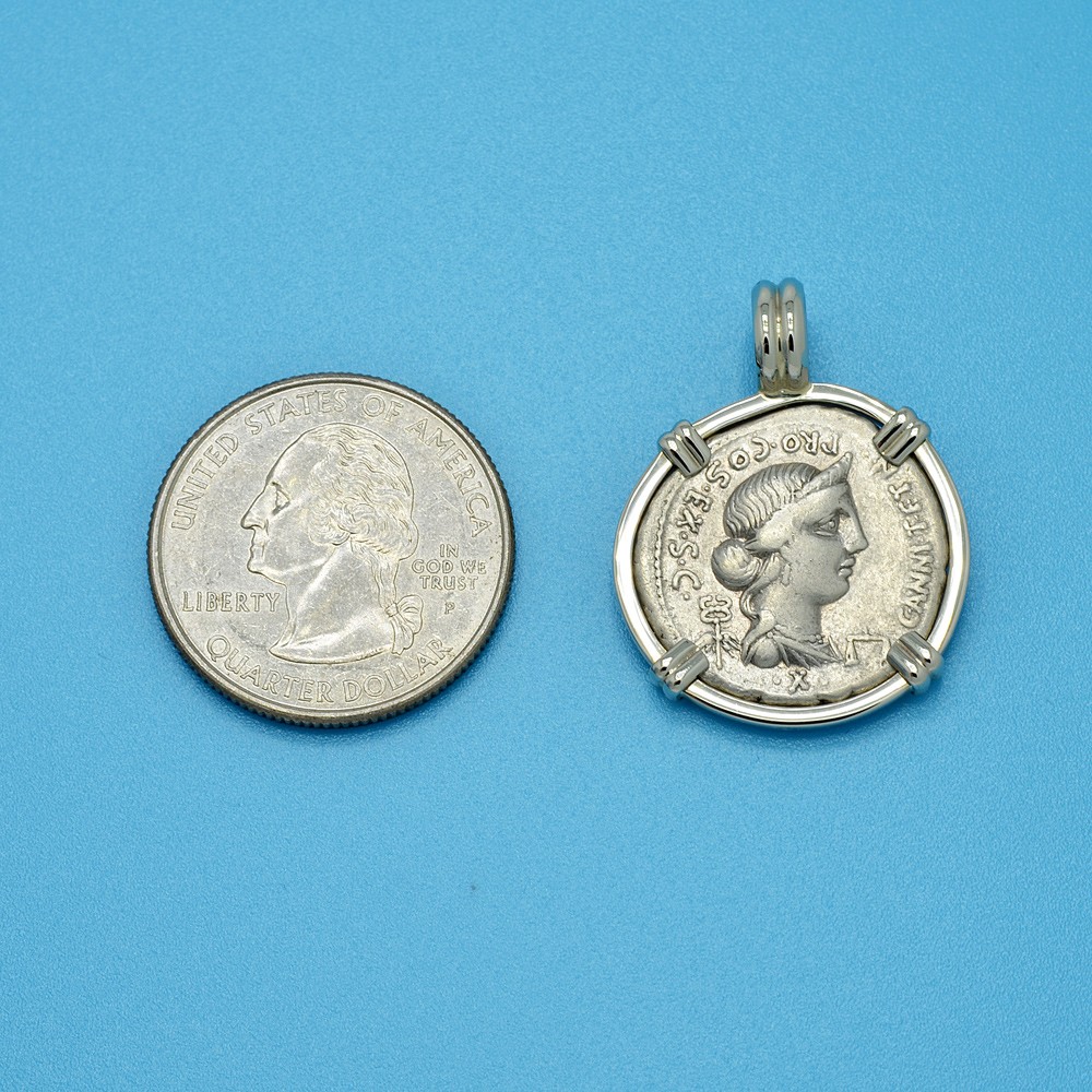 This silver denarius coin was minted in the Roman region of Hispania (present day Spain), by moneyers Caius Annius and Lucius Fabius in 82-81 BC. The obverse of this Roman Republic coin shows the head of Anna Perenna wearing a stephane and a caduceus is shown behind her. The Latin legend translates to: "Caius Annius, Son of Titi, Grandson of Titi, Proconsul, Issued by Decree of the Senate." The prominent Roman family of Caius Annius claimed to be descendant from Anna Perenna.