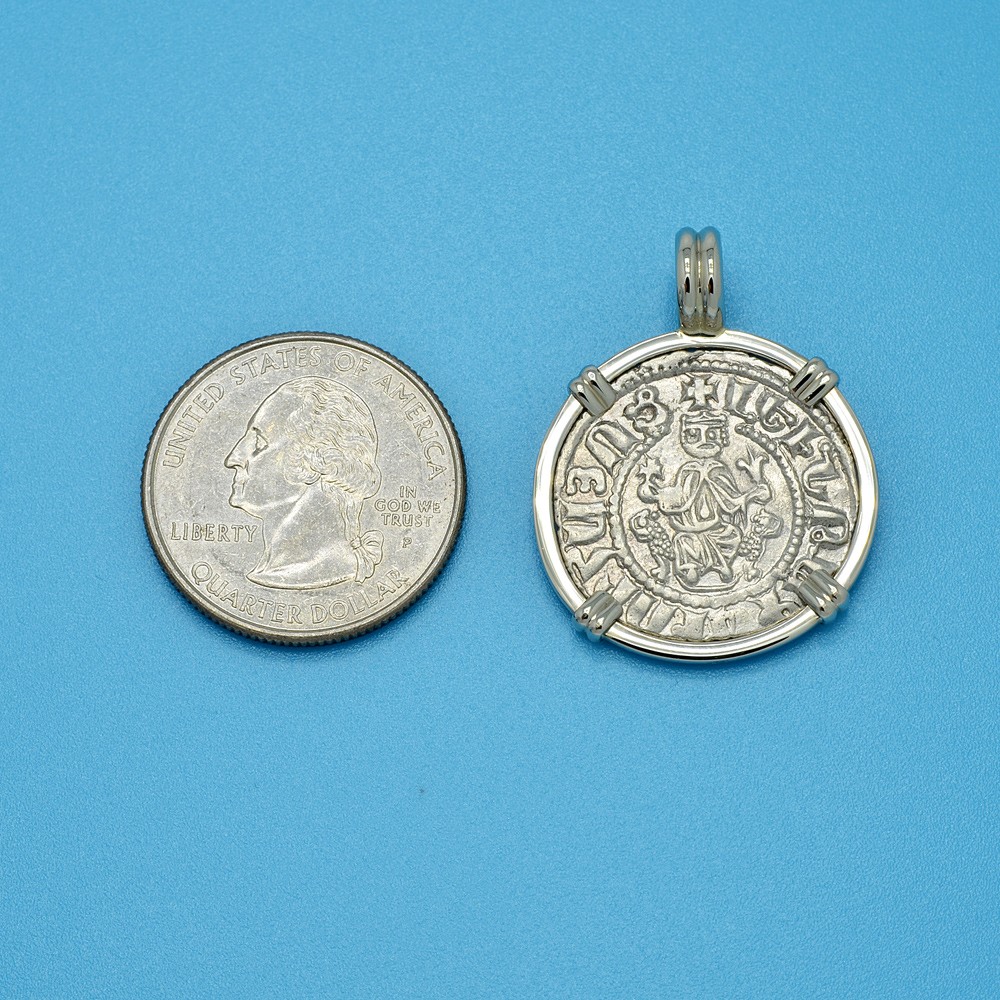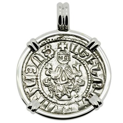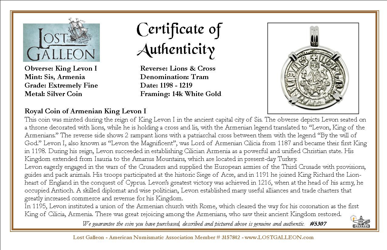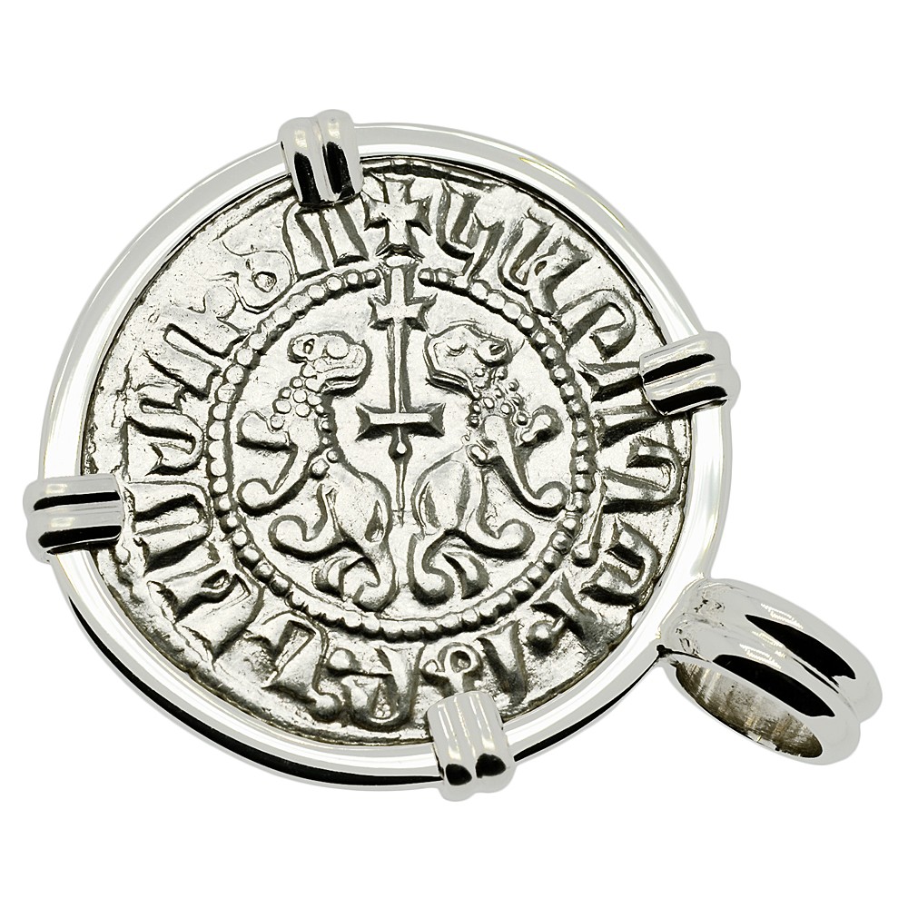 This coin was minted during the reign of King Levon I in the ancient capital city of Sis. The obverse depicts Levon seated on a throne decorated with lions, while he is holding a cross and lis, with the Armenian legend translated to “Levon, King of the Armenians.” The reverse side shows 2 rampant lions with a patriarchal cross between them with the legend “By the will of God.” Levon I, also known as “Levon the Magnificent”, was Lord of Armenian Cilicia from 1187 and became their first King in 1198. During his reign, Levon succeeded in establishing Cilician Armenia as a powerful and unified Christian state. His Kingdom extended from Isauria to the Amanus Mountains, which are located in present-day Turkey.