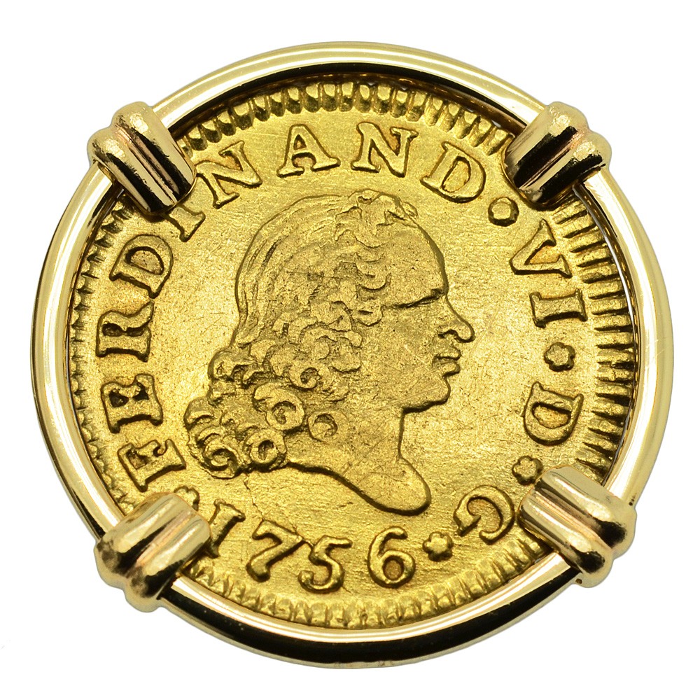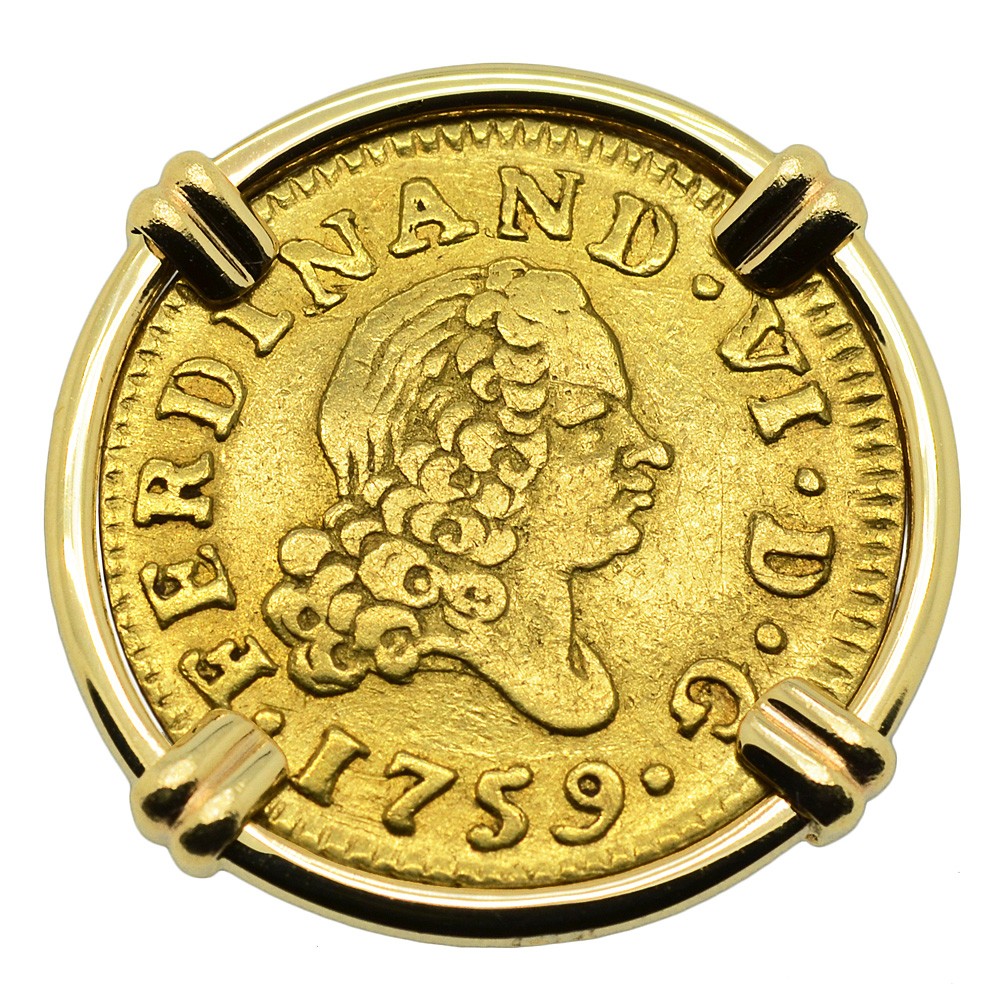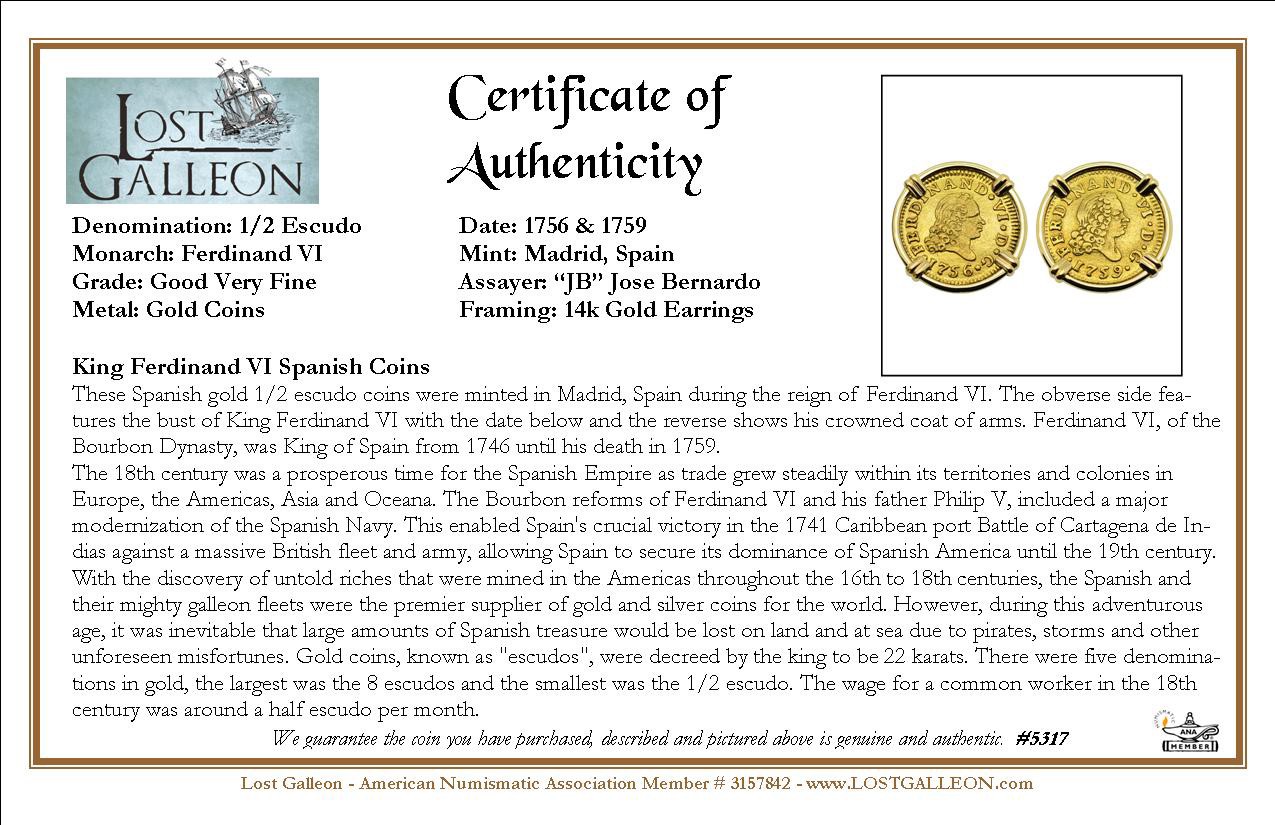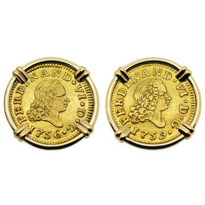 These Spanish gold 1/2 escudo coins were minted in Madrid, Spain during the reign of Ferdinand VI. The obverse side features the bust of King Ferdinand VI with the date below and the reverse shows his crowned coat of arms. Ferdinand VI, of the Bourbon Dynasty, was King of Spain from 1746 until his death in 1759.