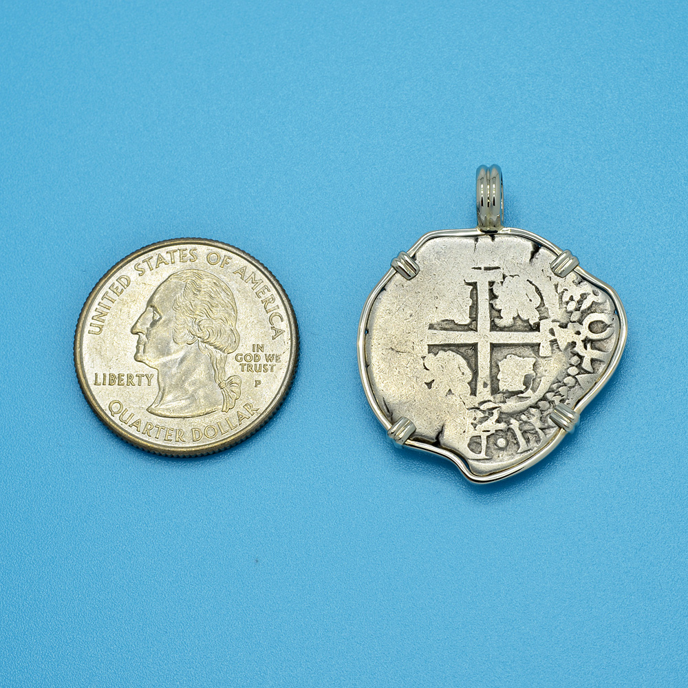 This is a genuine Spanish silver coin that was minted in the colonial South American mint of Potosi, Peru. In 1533, four decades after Columbus landed in the New World, Spanish conquistador Francisco Pizarro conquered the Inca Empire in Peru. Soon after, high in the Andes Mountains at Potosi, the Spanish discovered the richest silver deposits in the world and in 1575 they opened the mint in Potosi.