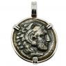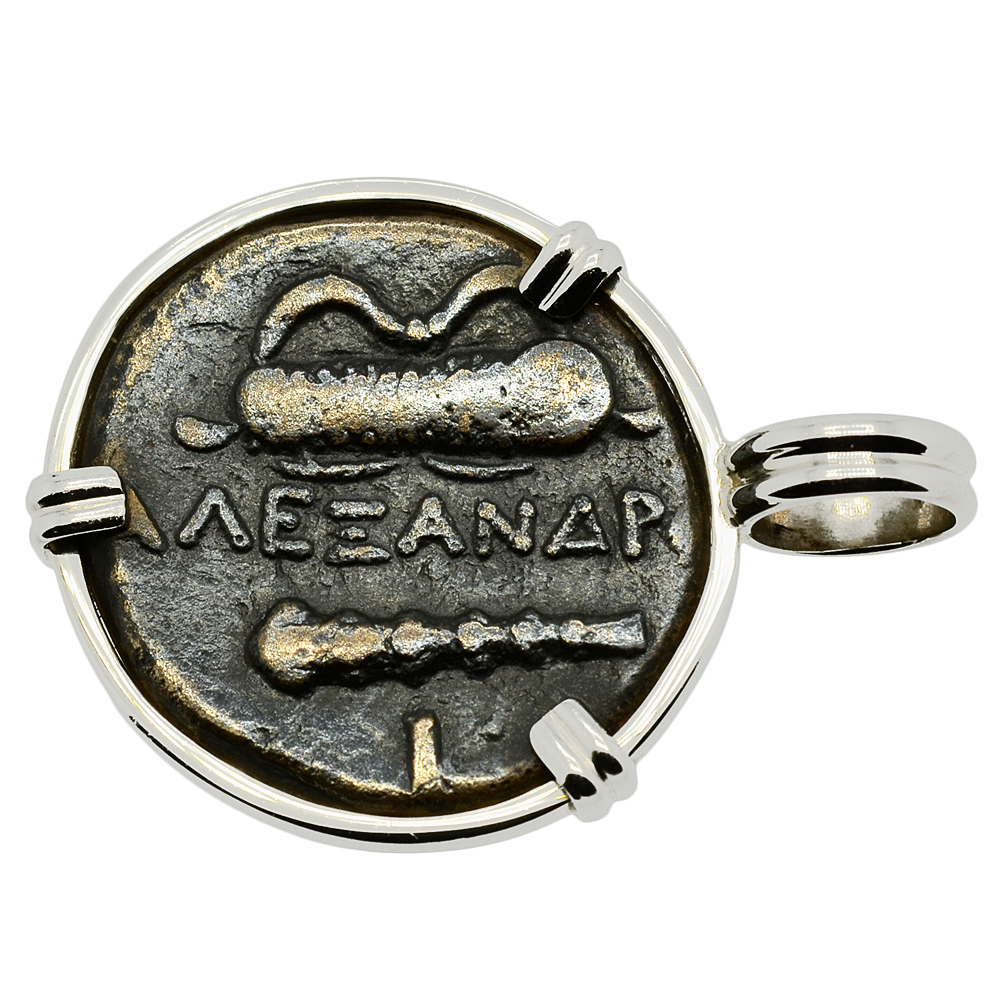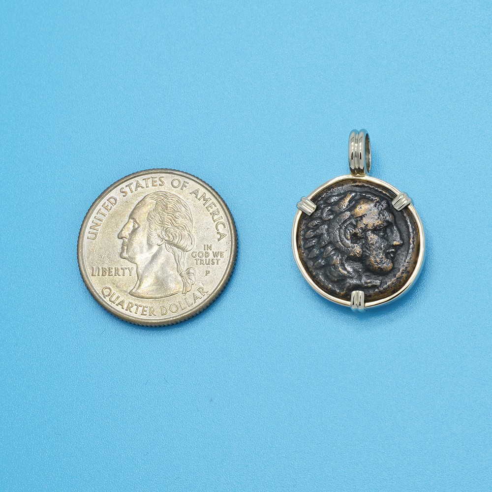 The obverse of this Alexander the Great coin features the greatest of all the Greek heroes Hercules, wearing the impenetrable pelt of the Nemean Lion. In Greek mythology, Hercules was the son of Zeus and worshiped by the ancient Greeks for the stories of his extraordinary strength, courage and ingenuity. He was best known for accomplishing the 12 Labours, which included killing the Nemean Lion, destroying the Hydra and capturing the Cretan Bull. Hercules was important to Alexander's hereditary line, as he claimed to be descended from the mythological hero. The reverse side of this 4th century BC hand struck bronze coin shows Alexander’s name in Greek between a bow in a bow case and a club.
