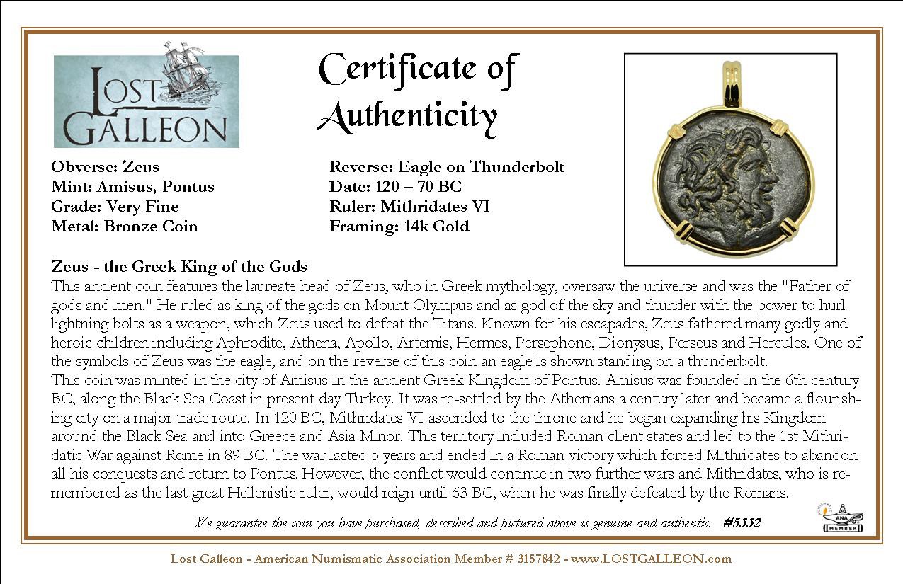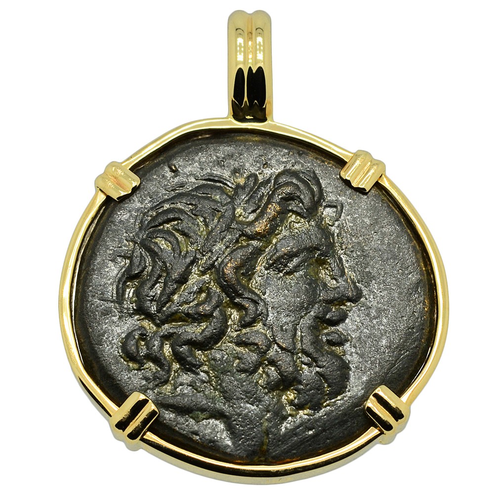 This ancient coin features the laureate head of Zeus, who in Greek mythology, oversaw the universe and was the "Father of gods and men." He ruled as king of the gods on Mount Olympus and as god of the sky and thunder with the power to hurl lightning bolts as a weapon, which Zeus used to defeat the Titans. Known for his escapades, Zeus fathered many godly and heroic children including Aphrodite, Athena, Apollo, Artemis, Hermes, Persephone, Dionysus, Perseus and Hercules. One of the symbols of Zeus was the eagle, and on the reverse of this coin an eagle is shown standing on a thunderbolt.