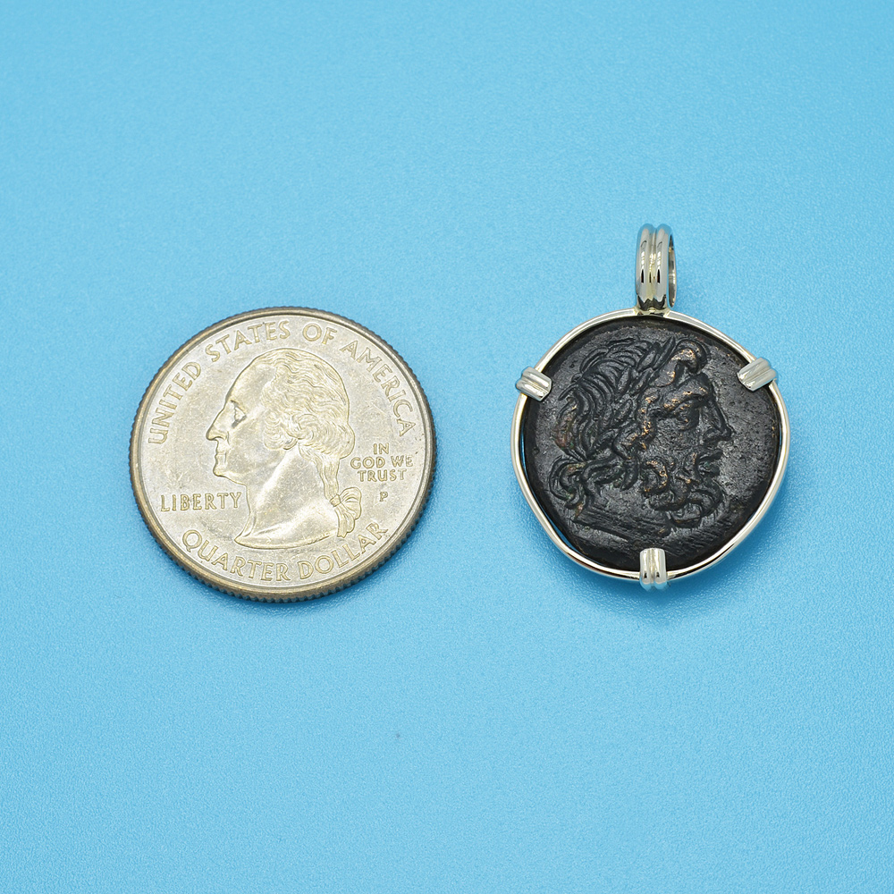 This ancient coin features the laureate head of Zeus, who in Greek mythology, oversaw the universe and was the "Father of gods and men." He ruled as king of the gods on Mount Olympus and as god of the sky and thunder with the power to hurl lightning bolts as a weapon, which Zeus used to defeat the Titans. Known for his escapades, Zeus fathered many godly and heroic children including Aphrodite, Athena, Apollo, Artemis, Hermes, Persephone, Dionysus, Perseus and Hercules. One of the symbols of Zeus was the eagle, and on the reverse of this coin an eagle is shown standing on a thunderbolt.