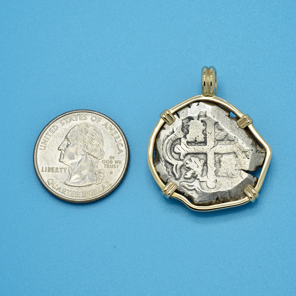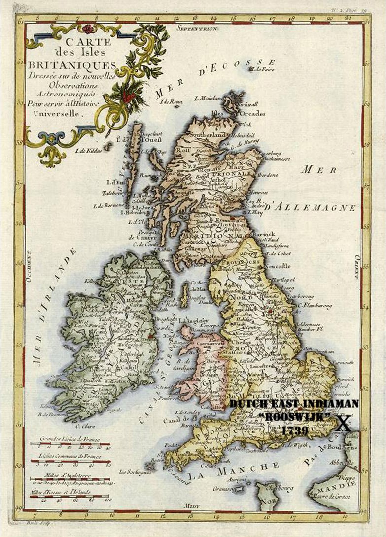 Salvager certificate is also included. This is a genuine Spanish silver four reales coin recovered from the shipwreck of the Dutch “VOC” East Indiaman ship Rooswijk. At 145 feet in length and 850 tons, the Rooswijk was a heavily armed ship with 30 guns and a crew of 250 men. With a cargo that included 30 chests of silver treasure, the Rooswijk, under Captain Dan Ronzieres, set off from the Dutch port of Texel on her 2nd voyage to the East Indies. On December 19th, 1739, the Rooswijk sailed in a storm off the southeast coast of England. That day, with all hands on board, the Rooswijk sank without a trace along an area known as the Goodwin Sands.