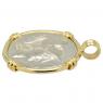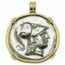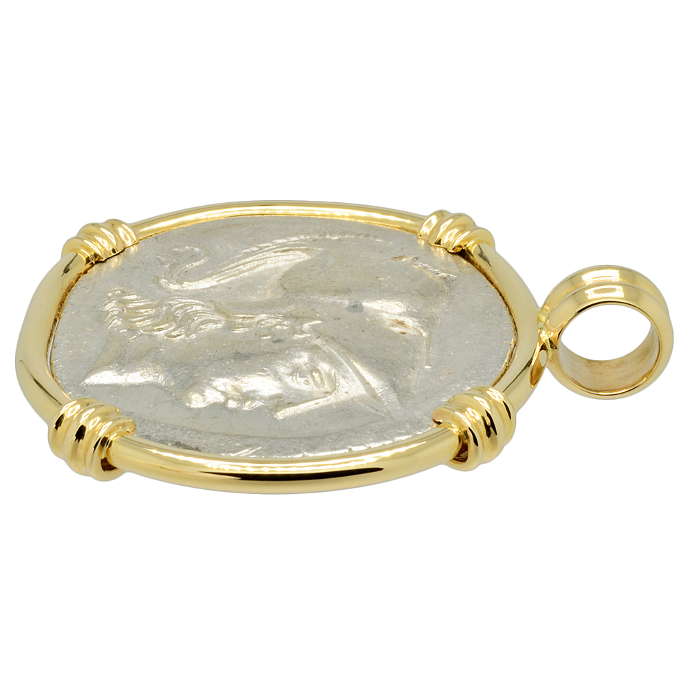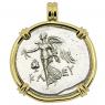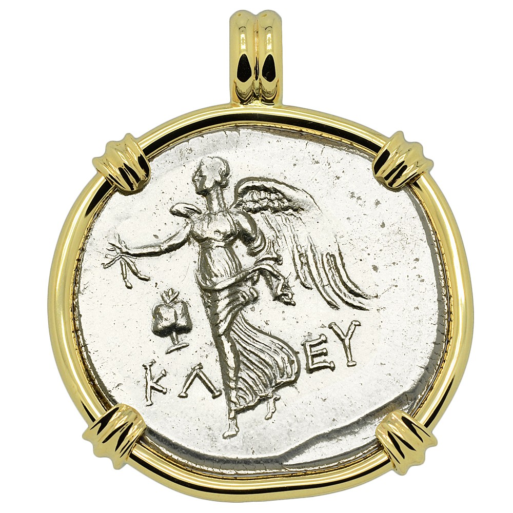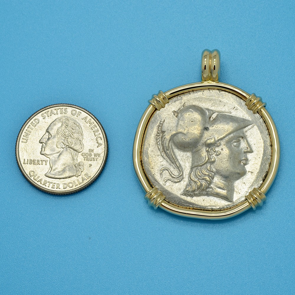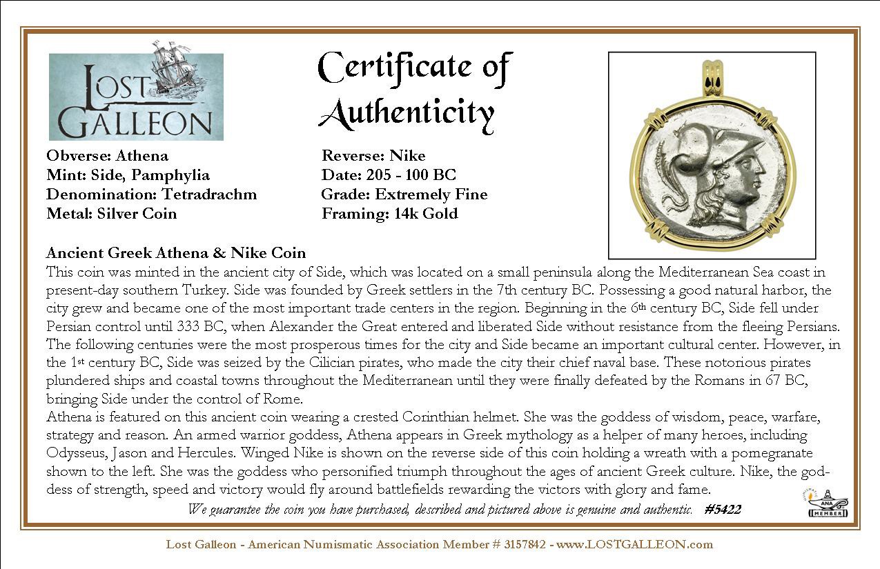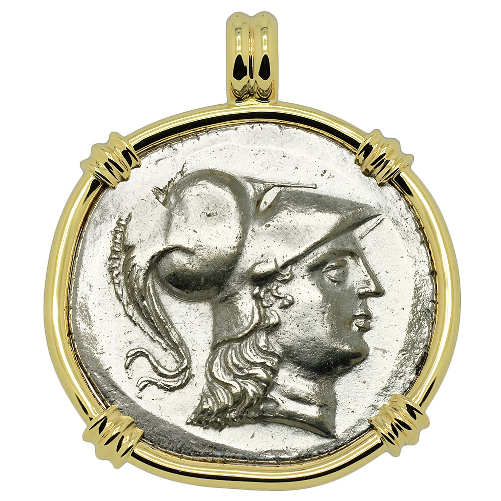 Athena is featured on this ancient coin wearing a crested Corinthian helmet. She was the goddess of wisdom, peace, warfare, strategy and reason. An armed warrior goddess, Athena appears in Greek mythology as a helper of many heroes, including Odysseus, Jason and Hercules. Winged Nike is shown on the reverse side of this coin holding a wreath with a pomegranate shown to the left. She was the goddess who personified triumph throughout the ages of ancient Greek culture. Nike, the goddess of strength, speed and victory would fly around battlefields rewarding the victors with glory and fame.