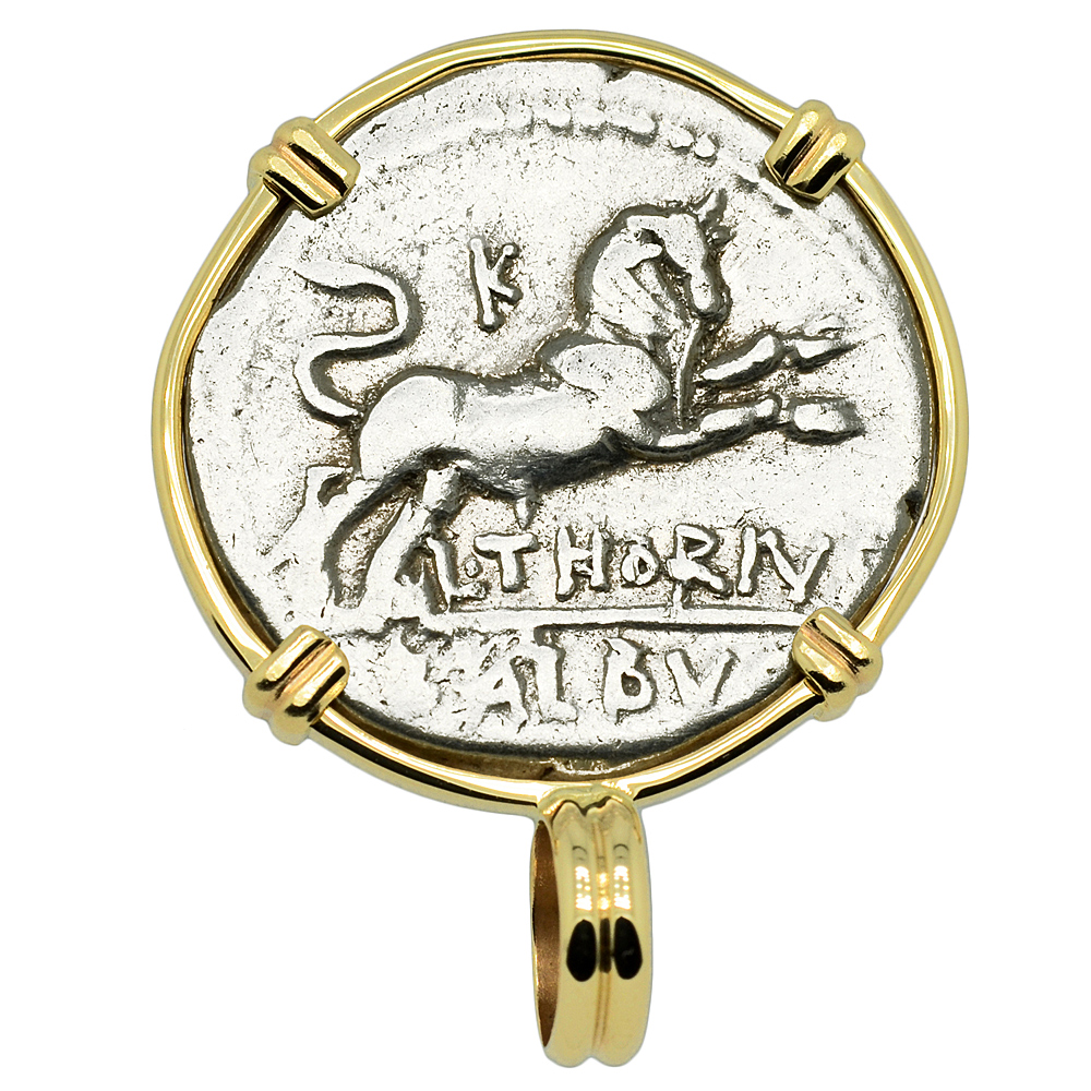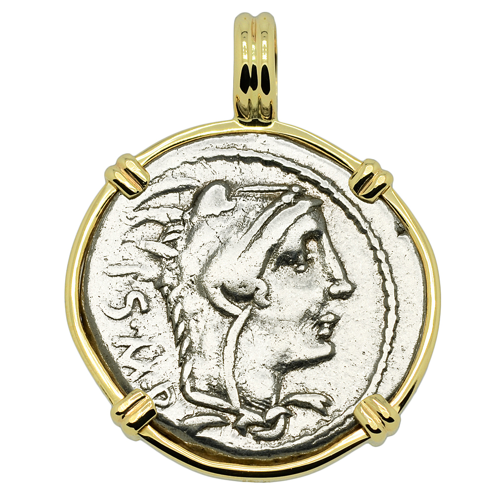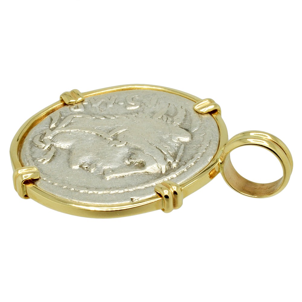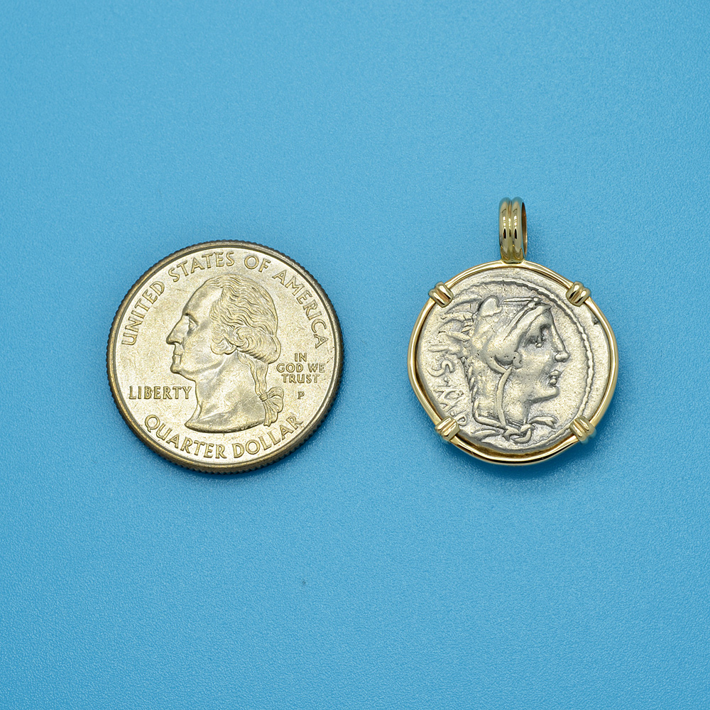 • Silver Denarius Coin in 14k Gold Pendant, Weight 5.2g