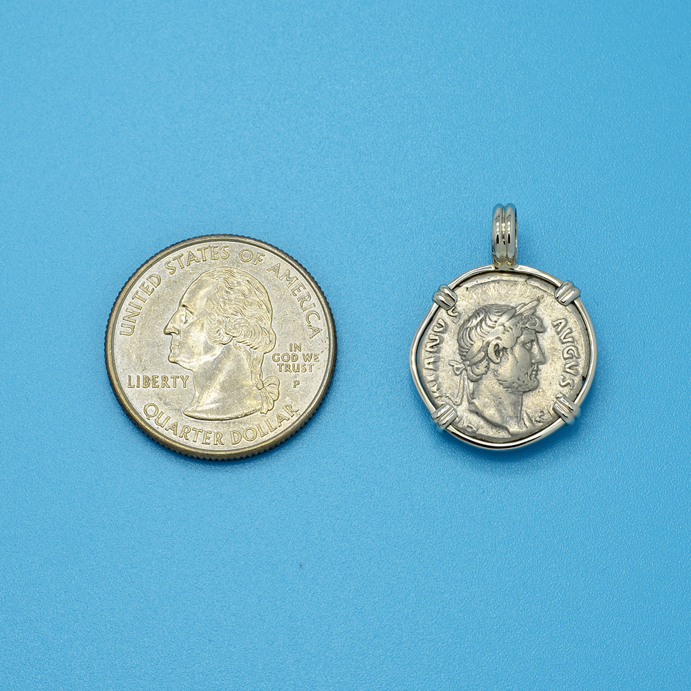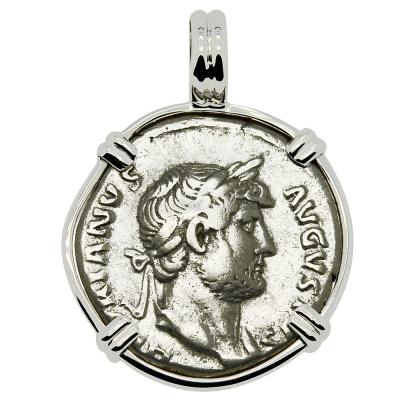 This denarius coin was minted in Rome during the rule of Hadrian, who was Roman Emperor from 117 to 138. The obverse side features the laureate head of Hadrian with the legend HADRIANVS AVGVSTVS “Hadrian Augustus.” Hadrian is best known for building Hadrian's Wall, which marked the northern limit of Roman territory in Britain. A significant portion of the wall still exists and today is the most popular tourist attraction in Northern England. In Rome, he re-built the Pantheon and almost two thousand years later, its dome is still the world's largest unreinforced concrete dome.